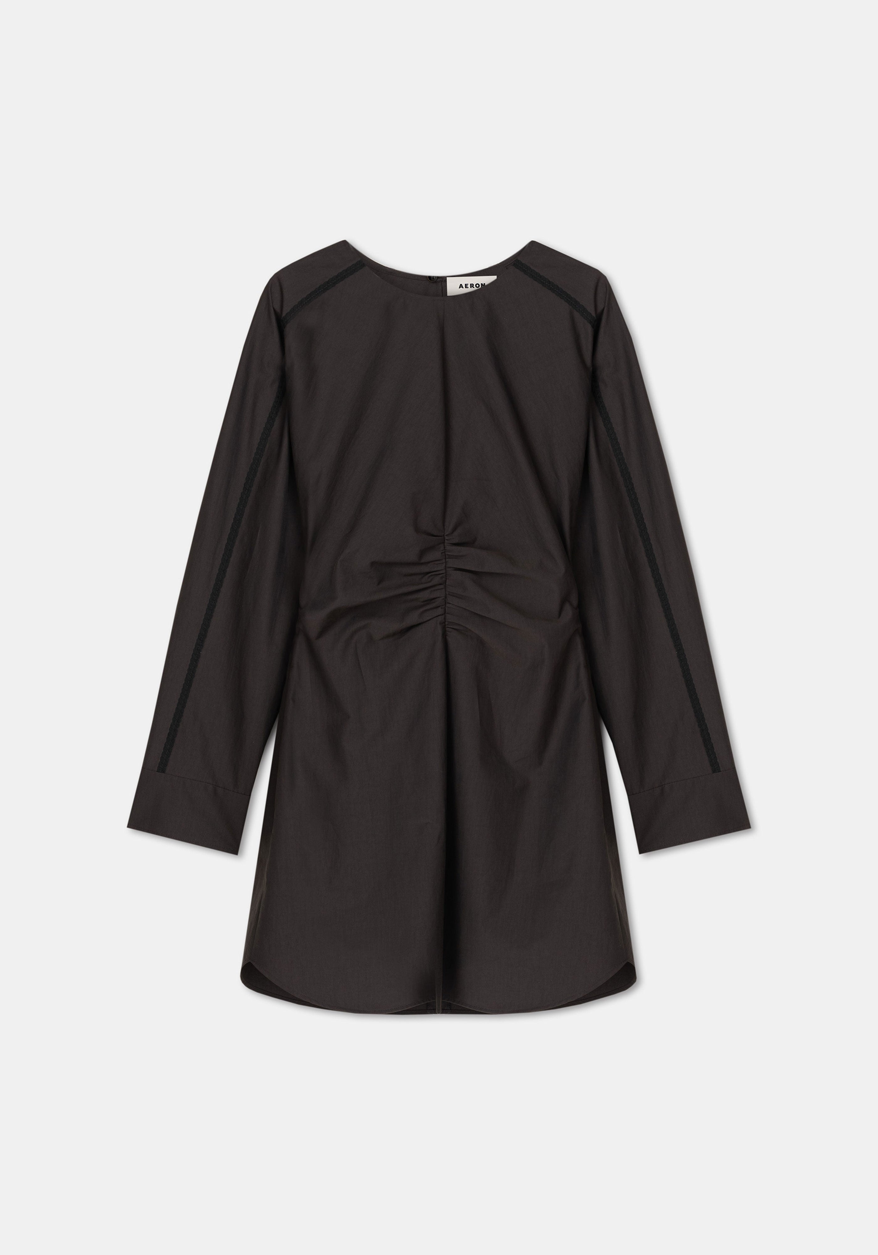 Our LILIAN poplin mini dress is tailored of a crispy cotton blend. This piece has a slightly waisted silhouette with ruched details at the centre front and back. It has shirt sleeves with a button closure. Size and Fit Fits true to size, take your normal size. The model is 180 cm and wears a size 36. Fabric and Care 89% Cotton 11% Poliamide Do not wash, Do not bleach, Do not tumble dry, Iron low temperature, Suitable for dry cleaning, Suitable for professional wet cleaning
