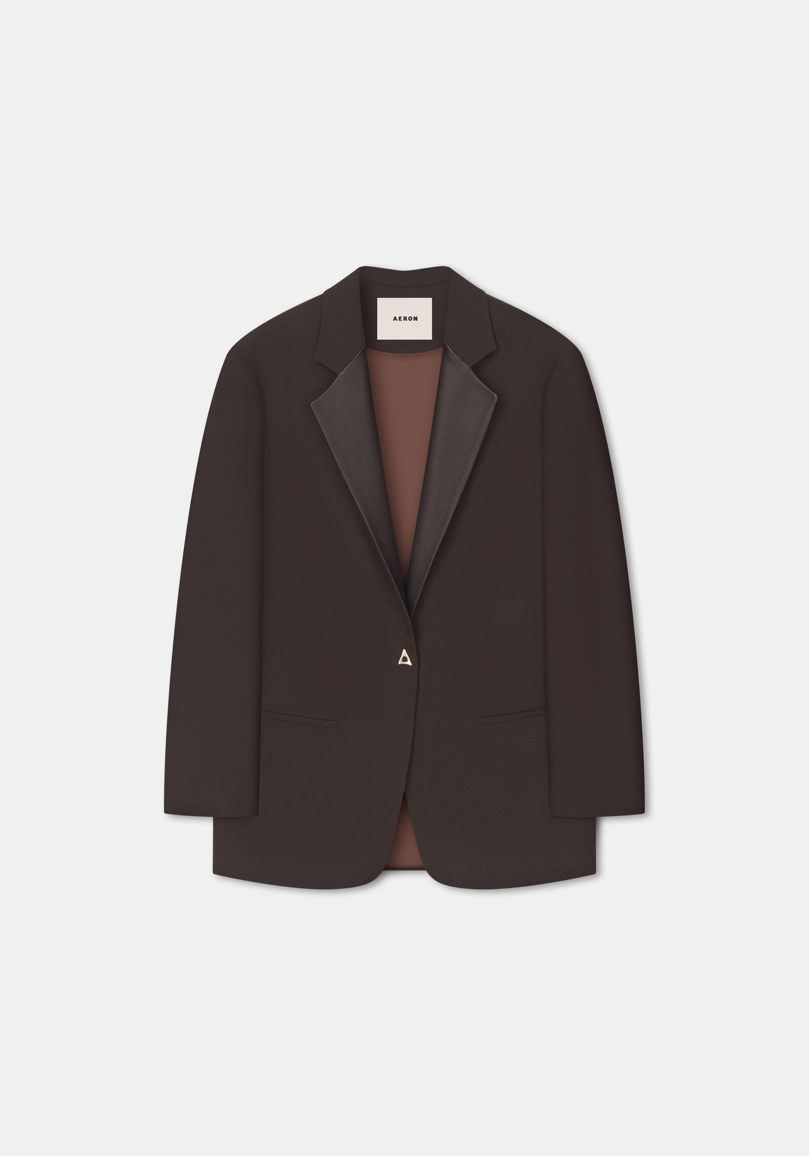 Our signature MERCEDES single-breasted blazer features a sharp leather-paneled collar and a high slit at the back, bringing a bold contrast and architectural elegance to tailoring. The defined shoulders and clean lines elevate its refined silhouette, while the A-button adds a subtle yet distinctive touch. Size and Fit Fits true to size, take your normal size. Fabric and Care 68% polyester, 29% viscose, 3% elastane, Lining: 100% viscose Do not wash, Do not bleach, Do not tumble dry, Iron at low temperature, Dry clean