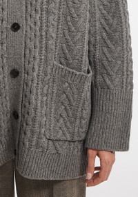 Our SIERRA cable-knit cardigan is made of pure wool. This V-neck style is designed with a relaxed silhouette, front patch pockets, and a button-up closure. Featuring an intricate cable-knit texture throughout, it’s a timeless layering piece that brings warmth and structure to your everyday wardrobe. Size and Fit Designed for a loose fit, in case you do not prefer a loose fit take one size smaller than usual. Fabric and Care 100% wool Hand wash cold or at 30°C, Do not bleach, Do not tumble dry, Do not iron, Dry clean