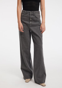 Our STEWART denim pants are made of pure cotton. This piece is designed with a high-rise waist and wide-leg silhouette for a modern yet timeless shape. The washed grey tone adds versatility, while the exposed button-fly closure gives it a utilitarian touch. A relaxed essential that pairs effortlessly with structured tops or layered knitwear. Size and Fit Fits true to size, take your normal size. Fabric and Care 100% cotton Hand wash at 30°C, Do not bleach, Do not tumble dry, Iron at low temperature, Dry clean