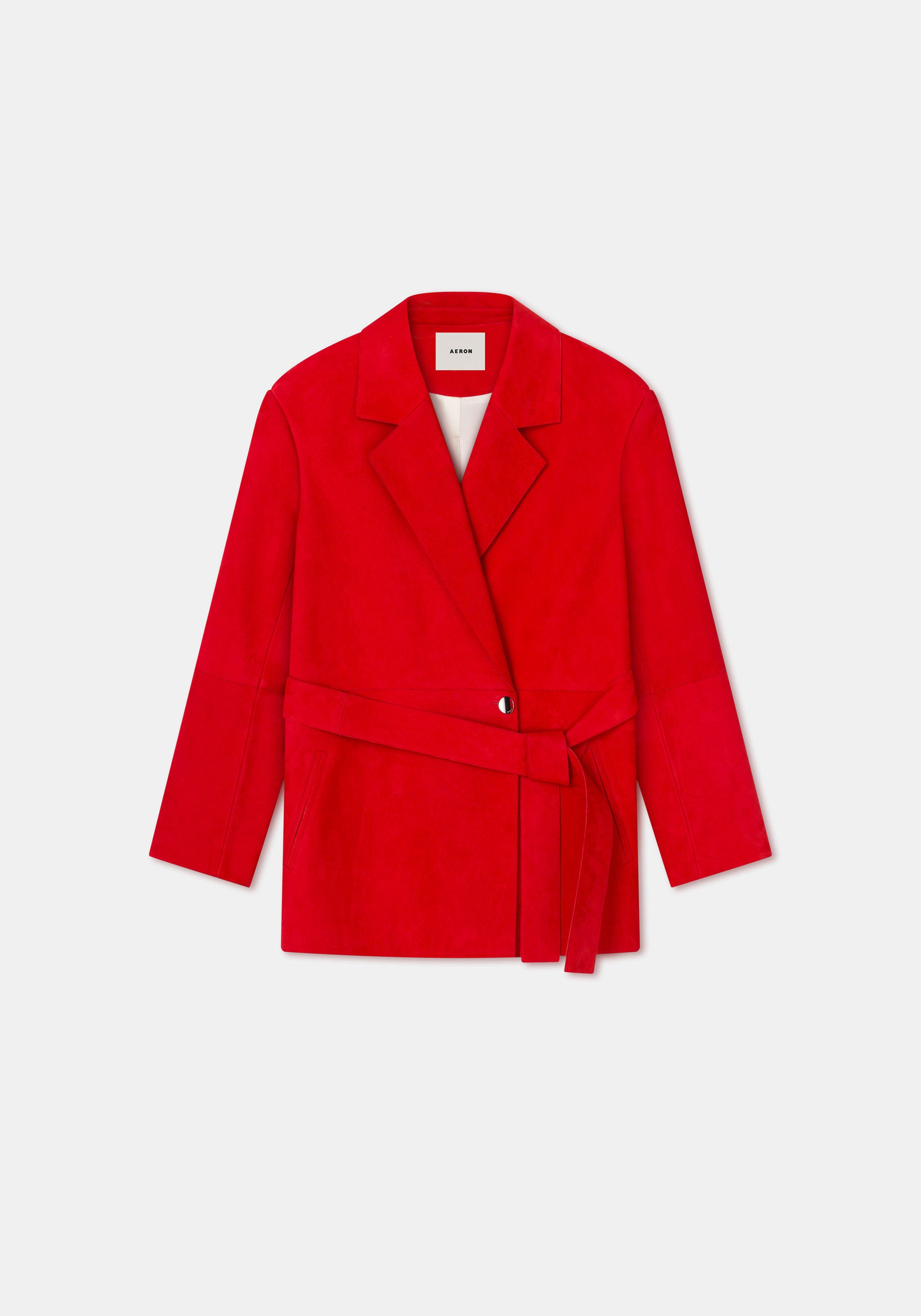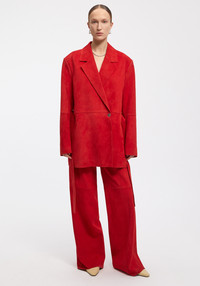 Our SWORD single-breasted suede blazer is made of super soft lamb leather that comes from traceable sources. This piece is cut to an oversized silhouette and has a wide, detachable belt to create an effortless look. Size and Fit Fits true to size, take your normal size. The model is 173 cm and wears a size 36. Fabric and Care 100% Lambskin leather Do not wash, Do not bleach, Do not tumble dry, Do not iron, Do not dry clean, Consult with leather specialist