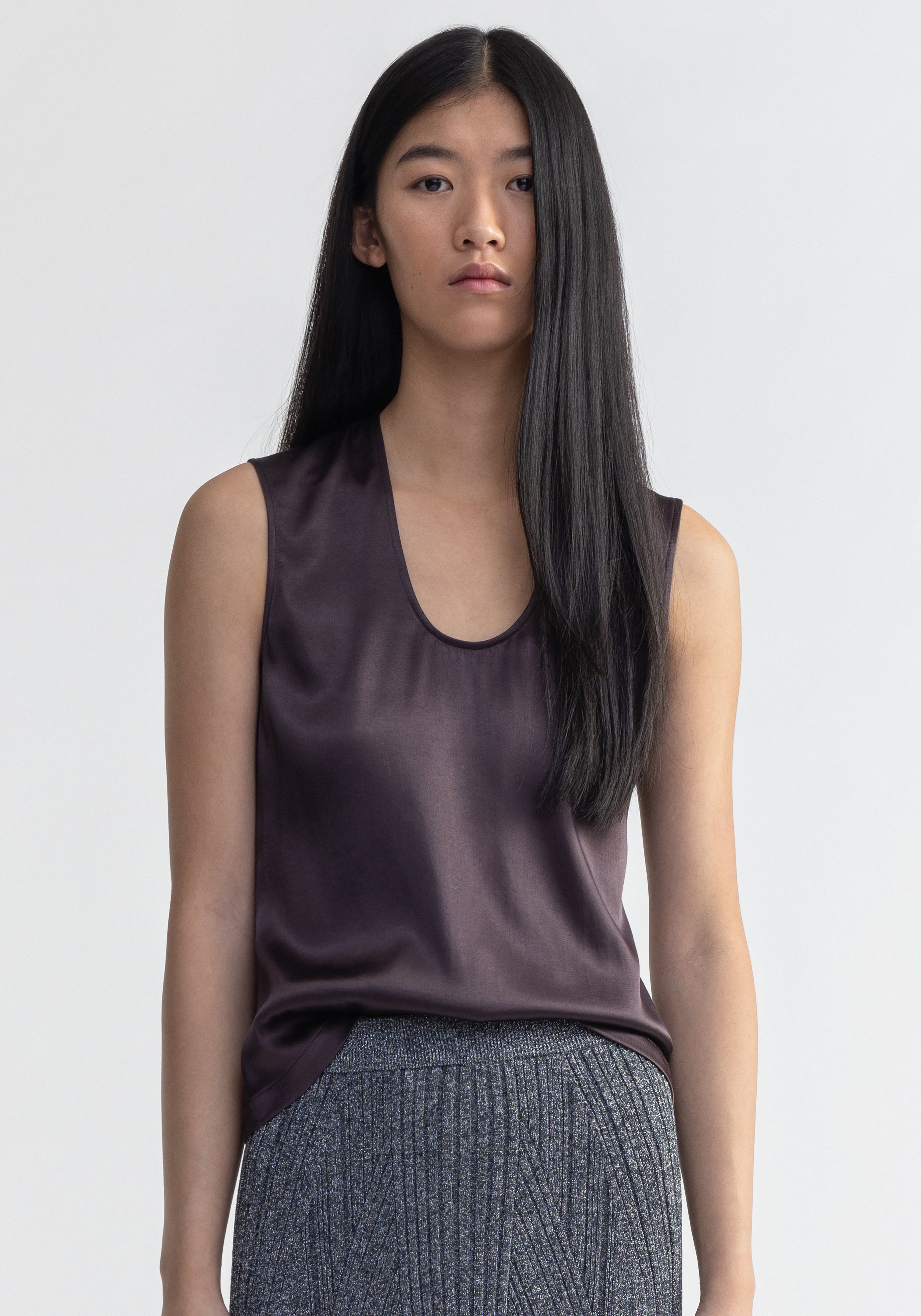 Our TUTU satin top is made of a sustainable FSC-certified viscose blend. This piece has a low neckline and a slightly waisted silhouette, creating gentle ruches. It is a versatile option for sophisticated party looks. Size and Fit Fits true to size, take your normal size. The model is 180 cm and wears a size 36. Fabric and Care 44% FSC Viscose 52% Rayon 4% Spandex Do not wash, Do not bleach, Do not tumble dry, Iron low temperature, Suitable for dry cleaning, Suitable for professional wet cleaning