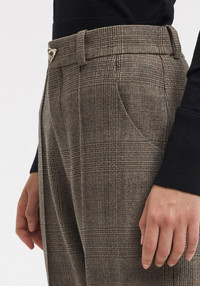 Our WENDERS straight-leg suiting pants are made a soft wool blend. Featuring a subtle checkered pattern, this versatile silhouette is defined by its sharp front pleats and exaggerated, cuffed hems, adding a tailored yet relaxed structure to the everyday work wardrobe. Size and Fit Fits true to size, take your normal size. Fabric and Care 50% polyester, 29% viscose, 21% wool, 7% nylon, 1% elastane Do not wash, Do not bleach, Do not tumble dry, Iron at low temperature, Dry clean