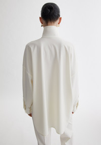 Our WHISK high neck overshirt channels a sculptural, effortless silhouette. Cut to an oversized fit, it features a stand collar and two structured flap pockets that lend subtle utility to its clean minimal design. The elongated sleeves and a curved hem enhance the fluidity of this piece, making it a versatile layer that elevates both tailored and relaxed looks. Fabric and Care 73% polyester, 19% viscose, 8% elastane Hand wash cold or at 30°C, Do not bleach, Do not tumble dry, Iron at low temperature, Dry clean