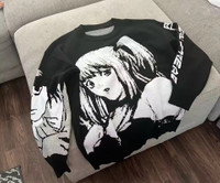Make a huge statement with this trendy, oversized anime graphic knit sweater! This black and white knit piece is a must-have for anyone into animecore, goth, streetwear, or e-girl aesthetics. The front features a large, detailed, black-and-white jacquard knit graphic of a popular female anime. The sweater has a drop-shoulder, oversized fit for a relaxed, slouchy look that is perfect for layering. Pair it with a plaid skirt or baggy denim for a perfect modern street look. Ready to ship • #Anime • #Knitwear • #Oversized • #Streetwear • #Y2K • #Waifu • #Gothic • #Jumper