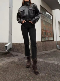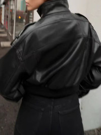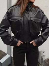 Elevate your rotation with this premium Cropped PU Leather Bomber. This piece combines a vintage Aviator silhouette with a modern, high-fashion cropped hem and aggressive utility detailing. Architecture & Features • Silhouette: Sharp, boxy-cropped fit with wide sleeves and a cinched ribbed elastic waistband for an hourglass-streetwear profile. • Collar: Versatile high-funnel neck design that can be worn fully zipped for a technical look or folded. • Utility Details: Featuring oversized dual chest flap pockets and tactical epaulets on the shoulders. • Material: Heavyweight, high-shine vegan PU leather that provides the structure of genuine hide with a sleek, polished finish. • Rear Design: Panelled back construction with gathered elastic detailing to ensure a perfect drape. Condition & Shipping • Status: New Item. Pristine condition. • Shipping: Lightning-fast dispatch. Shipping within 24-48 hours of purchase. Style Inspo Best styled with high-waisted denim and chunky boots to accentuate the cropped proportions. • Cropped, Biker, Utility, Gorpcore, Minimalist, Vegan Leather, Bomber, Streetwear, Archive, Cyber-punk. #newitem #leatherjacket #croppedbomber #streetwear #utility #highfashion #veganleather #bikercore