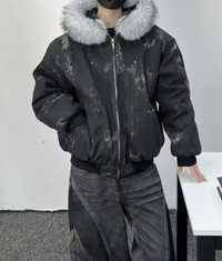 Distressed Acid-Wash Bomber Jacket - Faux Fur Hood Condition: Brand New / Never Worn Color: Faded Acid-Black Fit: Oversized / Boxy Silhouette Details: Up for sale is this high-quality, heavyweight distressed bomber jacket. This piece features a unique acid-washed patina throughout the body, giving it a vintage, industrial aesthetic. The oversized faux fur hood is plush and adds significant volume to the neckline, perfect for cold-weather layering. • Premium Hardware: Heavy-duty silver-tone front zipper. • Design Elements: Western-style yoke stitching on the chest and subtle rivet detailing. • Comfort: Ribbed elastic cuffs and waistband for a secure, cropped fit. • Storage: Two deep front welt pockets. This jacket fits perfectly into current Gorpcore, Avant-Garde, and Cyberpunk aesthetics. Compare to styles by Rick Owens, Diesel, or Entire Studios. Shipping & Policy • New Item: 10/10 condition. • Fast Shipping: Items are processed and shipped within 24-48 hours. • All sales are final. #Streetwear #BomberJacket #Distressed #AcidWash #FauxFur #Cyberpunk #Gorpcore #VintageAesthetic #MensFashion #Outerwear #WinterJacket #OversizedFit