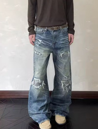 HEAVY Distressed Ultra-Baggy Denim - Y2K Stacked Fit Condition: Brand New / Premium Quality Style: Cyber-Y2K / Grunge / Streetwear / Baggy Fit The ultimate pair of statement denim for a heavy-stacking silhouette. These ultra-baggy jeans feature a curated vintage wash with aggressive hand-distressed detailing at the knees and thighs. Designed with an extra-wide leg opening to sit perfectly over chunky sneakers or boots. Design Details: • Silhouette: Extreme baggy fit with a wide leg opening for maximum stacking effect. • Distressing: High-contrast knee blowouts and intentional fraying for a worn-in grunge aesthetic. • Wash: Vintage-inspired faded blue with natural-looking whiskering and honeycombing on the back. • Hardware: Classic five-pocket construction with reinforced stitching and a durable belt loop system. Fit & Sizing: Waist 80 cm Length 105 cm Hip 114 cm • Waist: True to size for a high-waisted look, or size up for a low-slung baggy fit. • Inseam: Extra long to ensure the signature "stacked" look at the hem. Shipping & Shop Policy: • New Item: Pristine, unworn condition. • Shipping: Fast processing—dispatched within 24-48 hours. • Tracking: Provided immediately upon shipment. #baggydenim #y2k #grunge #distressed #streetwear #vintage #stackedjeans #cyber #wideleg #new #denim
