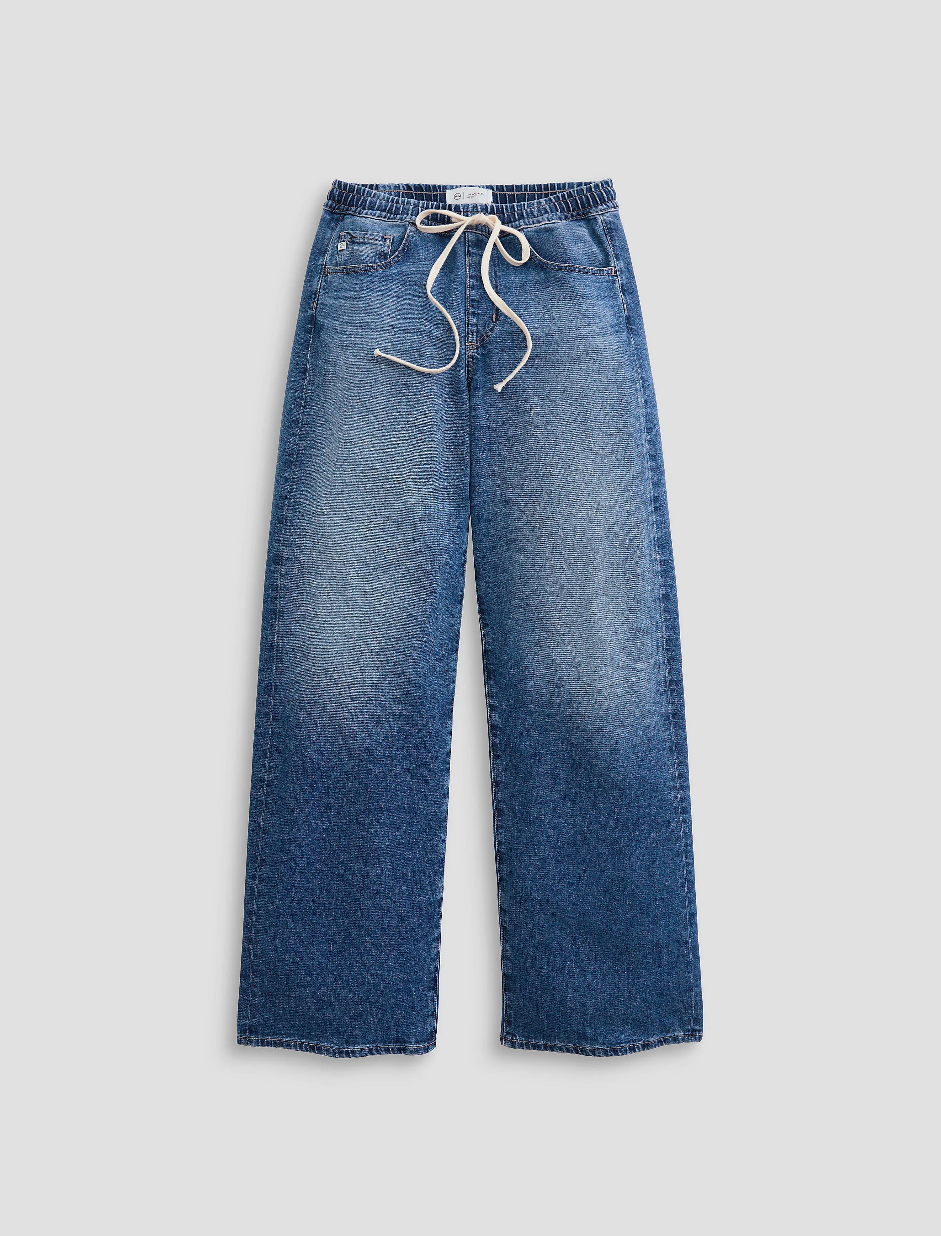 Low-Rise Wide Leg Your favorite Adria cinched below the waist with a self-tie drawstring closure, crafted from Daytripper Stretch Denim from the renowned Kaihara Mill in Japan. This jean is adored for its low-rise waist that hangs on the hip and a loose wide leg that puddles at the hem. Designed with highs and lows, whiskering, and light fading in our medium blue wash, Copenhagen. DETAILS & FIT Model is wearing a size 26. - Front Rise: 9 1/2" - Knee Opening: 22" - Bottom Opening: 21" - Inseam: 32" FABRIC & CARE Daytripper Stretch Denim, 10 Oz. 72% Cotton, 26% Lyocell, 2% Polyurethane