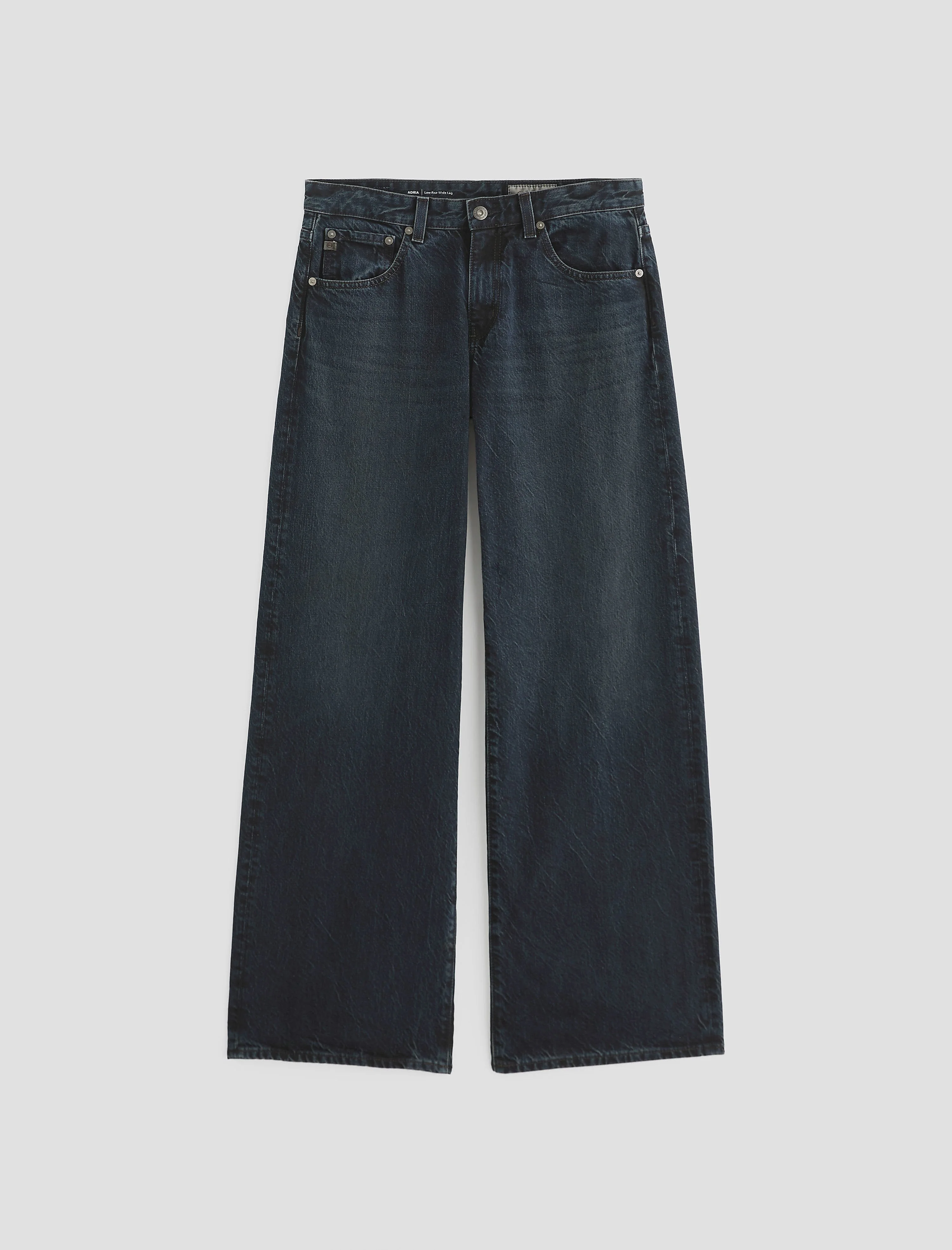 Low-Rise Wide Leg Adria is a low-rise, wide-leg pant crafted from non-stretch denim. AG-ed™ to replicate 2 years of authentic wear, offering a naturally broken-in look with vintage character. Crafted from premium denim sourced from Japan’s Kaihara Mill. DETAILS & FIT Model is wearing a size 26. - Front Rise: 9 1/2" - Knee Opening: 22" - Bottom Opening: 21" - Inseam: 32" FABRIC & CARE Legion Denim, 11.75 Oz. 100% Cotton