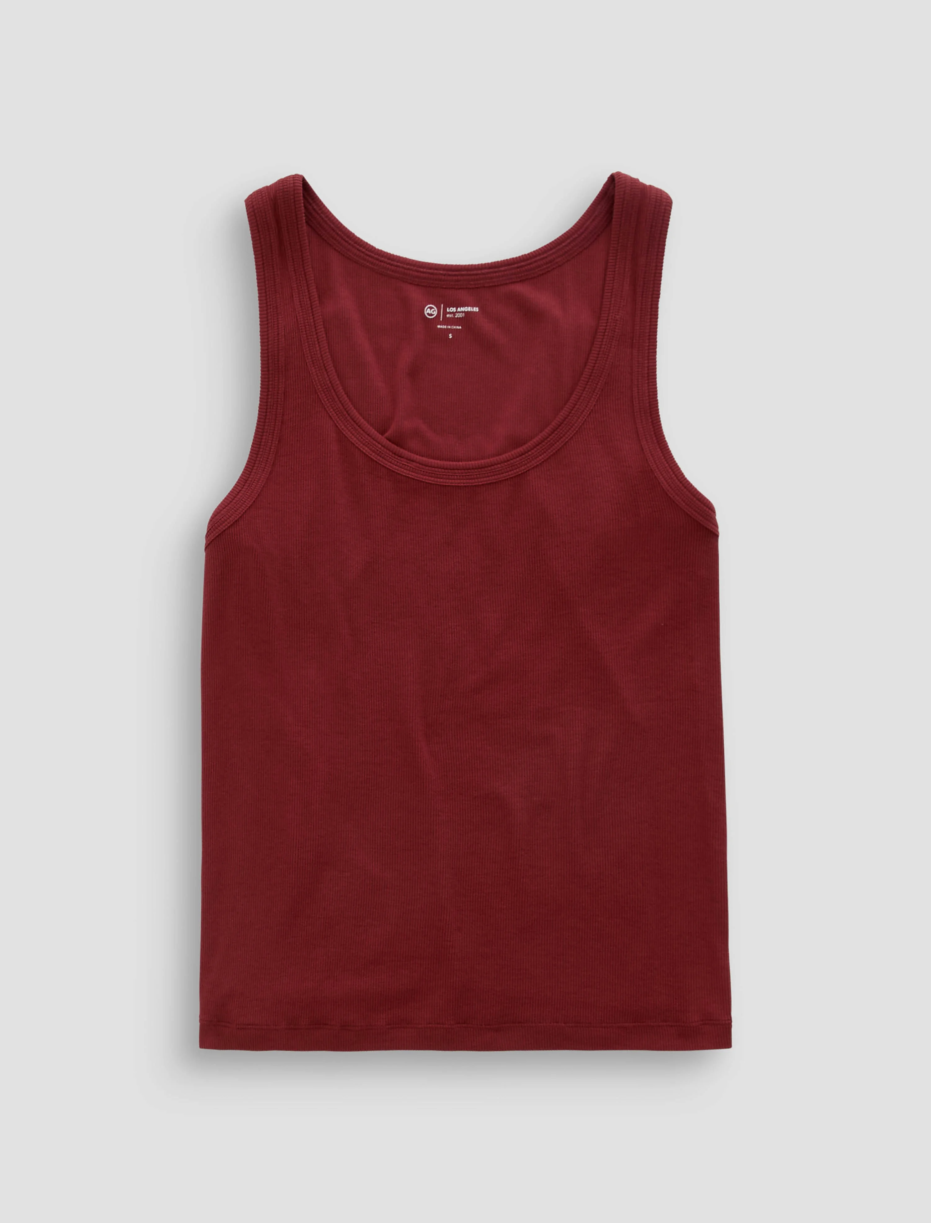 Essentials Rib Knit Ashley is a traditional scoop-neck tank knitted from Flex 2X2 Rib, our lyocell blend fabric with an easy drape and soft handfeel. This classic-fit closet anchor offers a body-skimming fit and textured finish that elevates this knit piece far beyond basic. The Ashley Tank features minimalist construction with reinforced seams and a durable finish to withstand daily wear and countless washes. Designed in a rusty brick red color, Adobe Clay. DETAILS & FIT Model is wearing size S. - Body Length: 23" - Chest Width: 28 1/2" FABRIC & CARE Flex 2X2 Rib, 75% Lyocell, 23% Polyester, 4% Spandex/Elastane