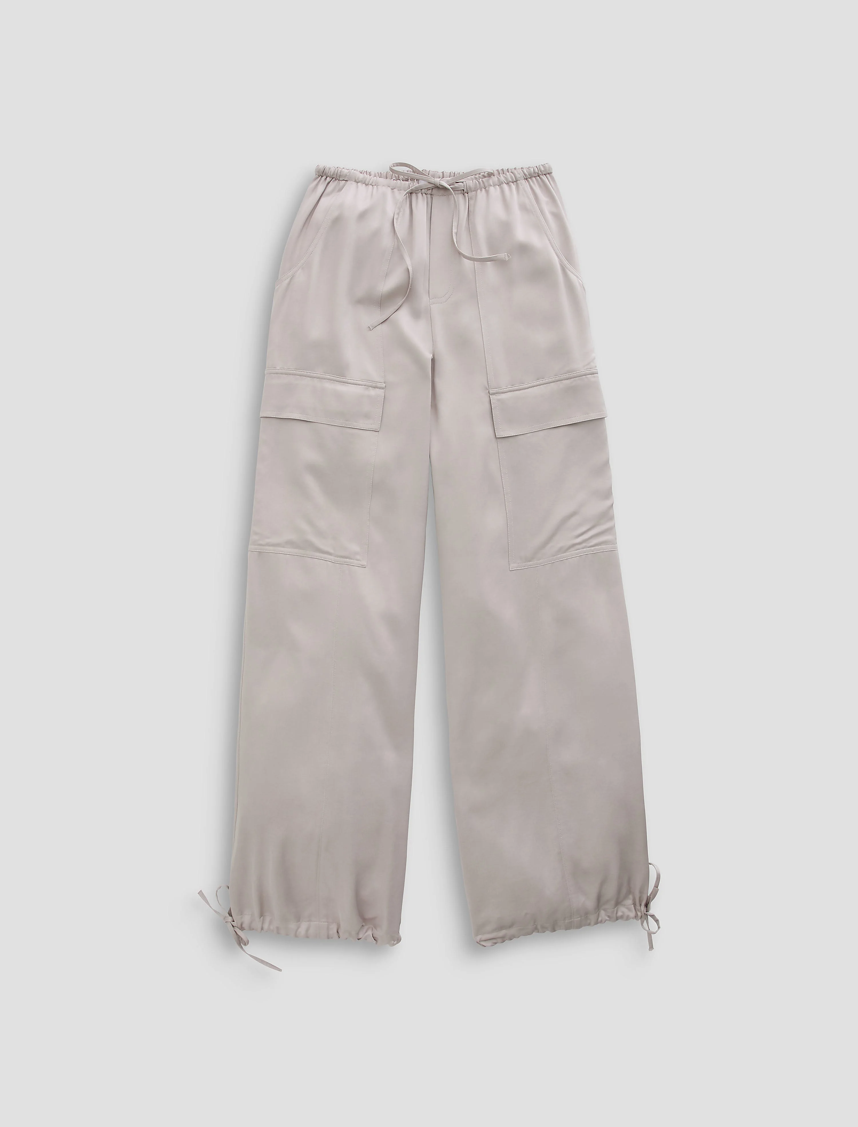 Relaxed Drawstring The Atwater Cargo is crafted in our Silky Flow Satin fabric for an airy, light construction with a liquid drape. This chic style combines utility detailing with a refined sheen for a luxury off-duty aesthetic. With a flowy fit, relaxed leg with oversized cargo flap pockets, and self-tie drawstring waist and hem, the Atwater Cargo creates a lustrous, laid-back look. Designed in a taupe grey color, Yucca Shadow. DETAILS & FIT Model is wearing size 26. - Front Rise: 11 3/8" - Knee Opening: 25 1/2" - Bottom Opening: 25 3/8" - Inseam: 32" FABRIC & CARE Silky Flow Satin, 67% Rayon, 33% Viscose
