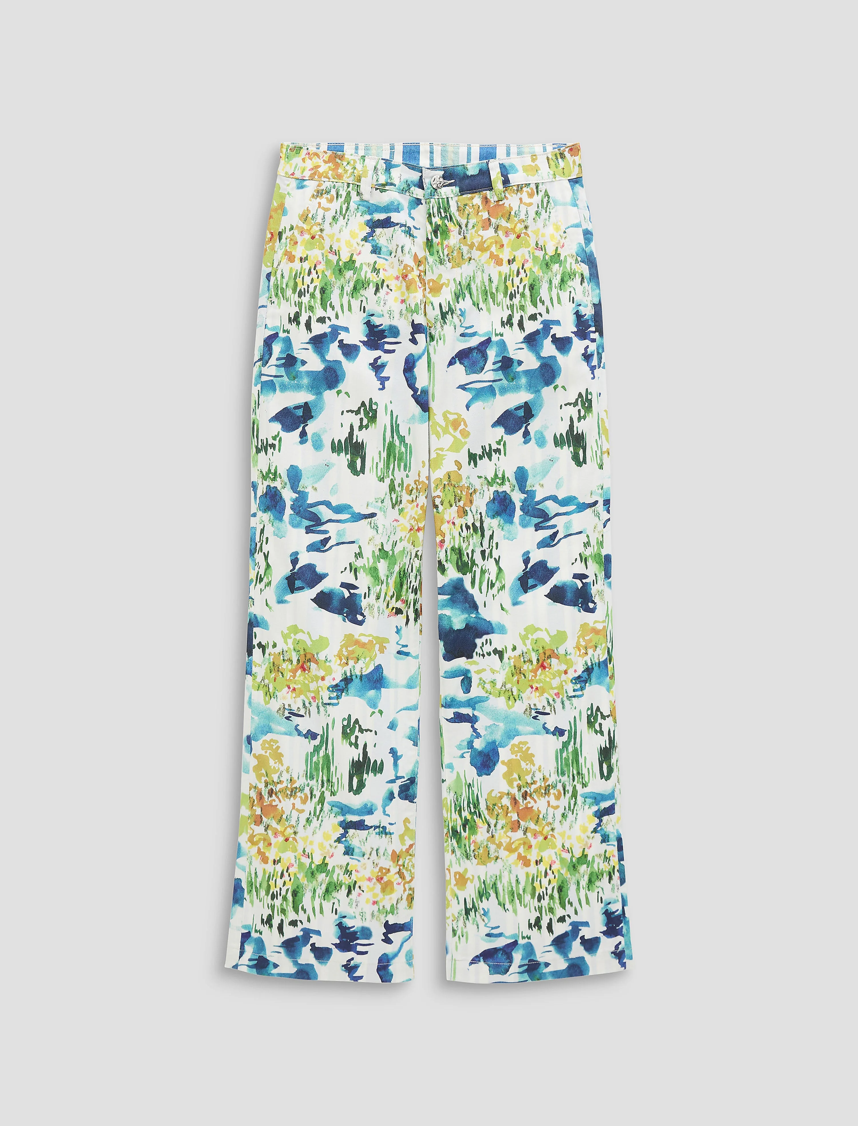 Mid-Rise Relaxed Inspired by the untamed beauty of the Channel Islands, the Caden Straight features a sophisticated abstract watercolor print, thoughtfully contrasted by a classic striped interior. Crafted in Sorrento Stretch Twill, these mid-rise trouser is adored for their easy, relaxed silhouette and straight leg. A bold expression of coastal artistry, these statement pants bring a sophisticated, artistic edge to your seasonal wardrobe. DETAILS & FIT Model is wearing size 26. - Front Rise: 10 1/2" - Knee Opening: 19 1/2" - Bottom Opening: 18" - Inseam: 29" FABRIC & CARE Sorrento Stretch Twill, 7.9 Oz. 68% Cotton, 27% Lyocell, 5% Elastane