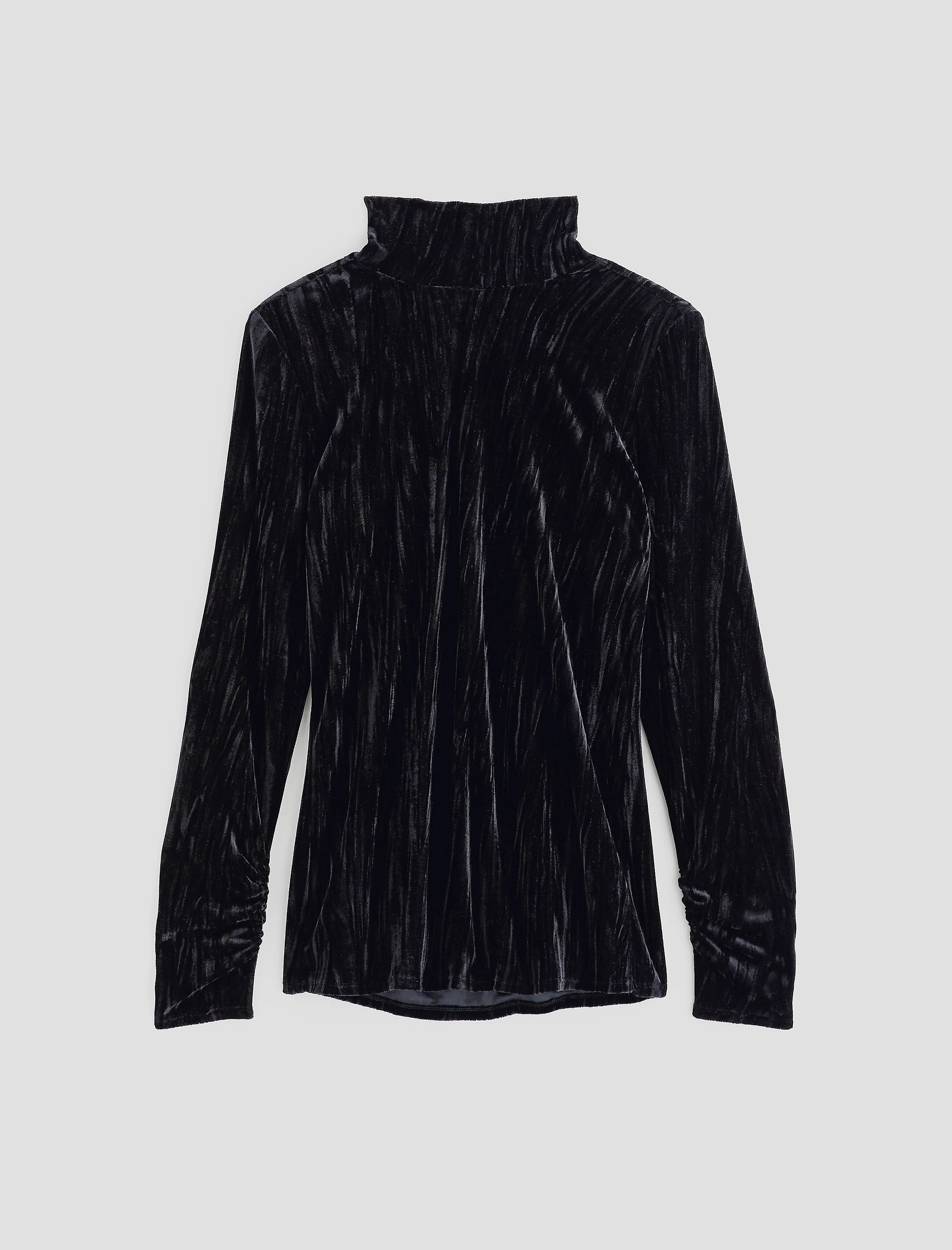 Open Back Crushed Velvet The Candice Velvet is an open back turtleneck. This wardrobe must-have is crafted from Liquid Velvet, a black crushed velvet that drapes beautifully on the body, featuring ruched long sleeves, turtleneck with a button closure at the center-back neckline, and an open back design. DETAILS & FIT Model is wearing size S. - Body Length: 25 1/2" - Chest Width: 32 3/4" - Sleeve Length: 25 1/2" FABRIC & CARE Liquid Velvet, 96% Polyester, 4% Spandex