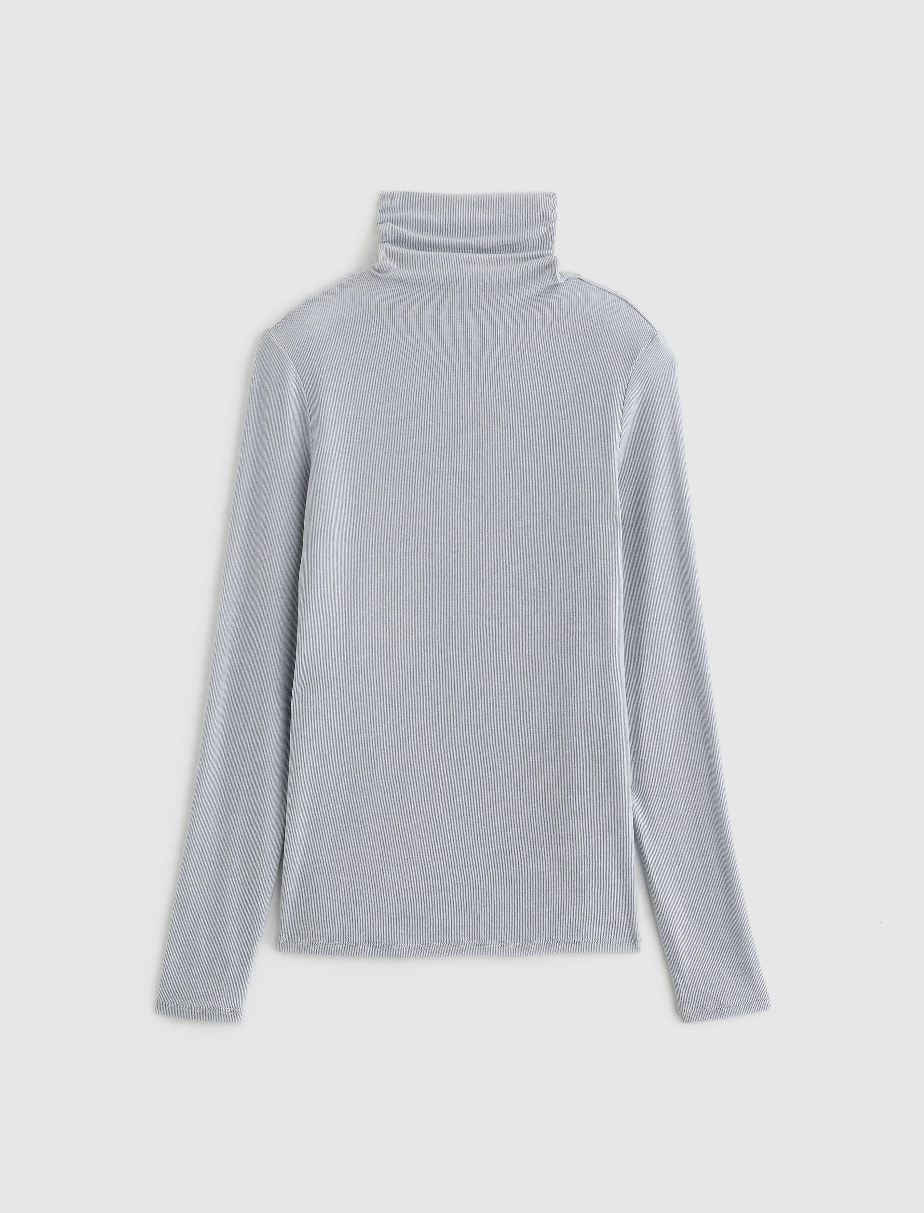 Slim Rib Knit The Chels Turtleneck in grey features a slim, form-fitting silhouette with a high, gently gathered neckline and extended sleeves. It's designed in a 2x1 Lyocell Rib, offering comfort and luxury in a wider rib construction. Our in-house looms deliver the precision knitting needed to accomplish the characteristic 2x1 weave that lends to the fabric’s superior comfort and draping qualities. DETAILS & FIT Model is wearing size S. - Body Length: 25" - Chest Width: 32" - Sleeve Length: 25" FABRIC & CARE 2x1 Lyocell Rib, 96% Lyocell, 4% Spandex/Elastane