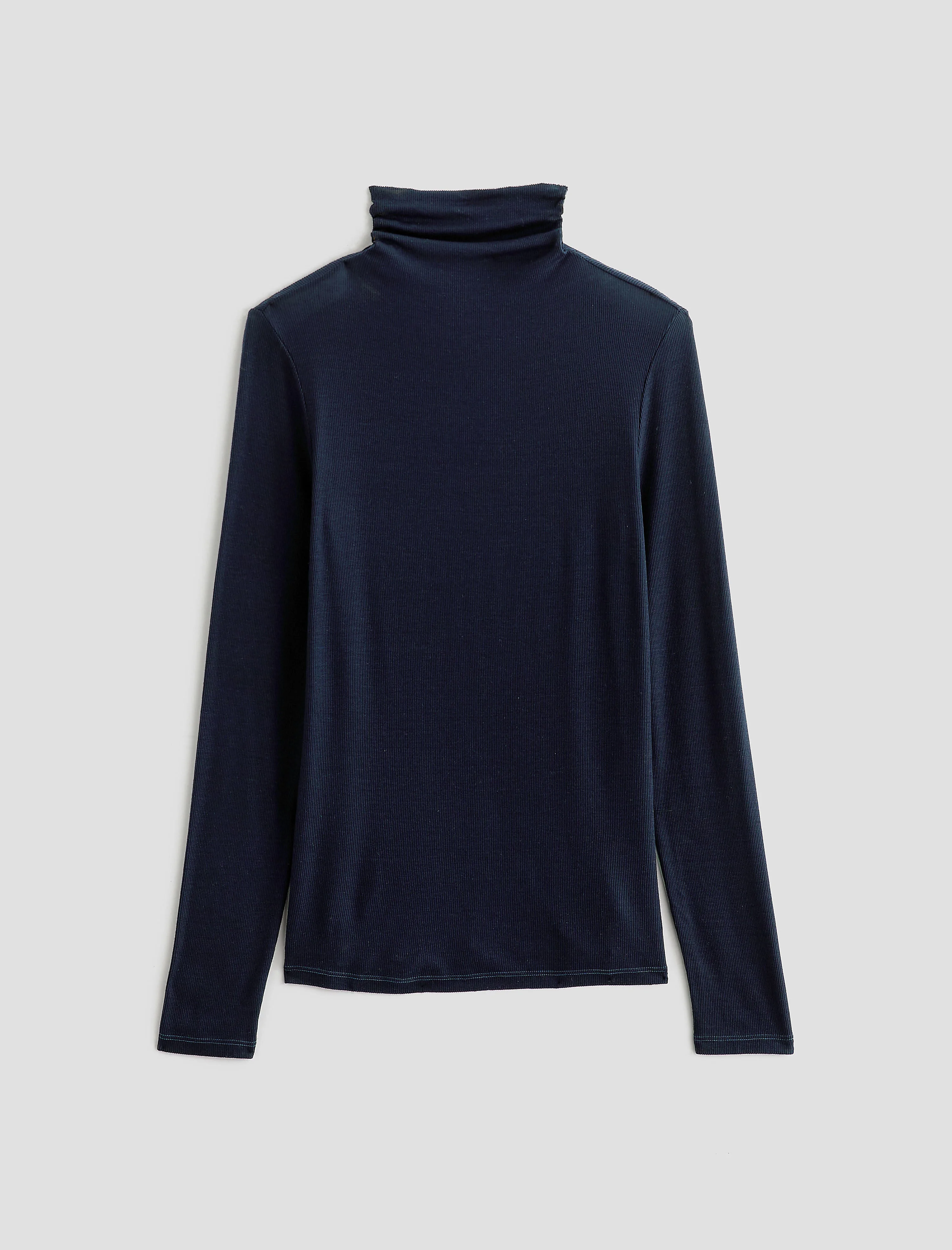 Slim Rib Knit The Chels Turtleneck has a slim, formfitting silhouette with a foldover neck and extended sleeves. Featuring a classic navy shade, this women’s top is designed in a 2x1 Lyocell Rib knit with a luxuriously comfortable feel that's soft against the skin. DETAILS & FIT Model is wearing size S. - Body Length: 25" - Chest Width: 32" - Sleeve Length: 25" FABRIC & CARE 2x1 Lyocell Rib, 96% Lyocell, 4% Spandex/Elastane