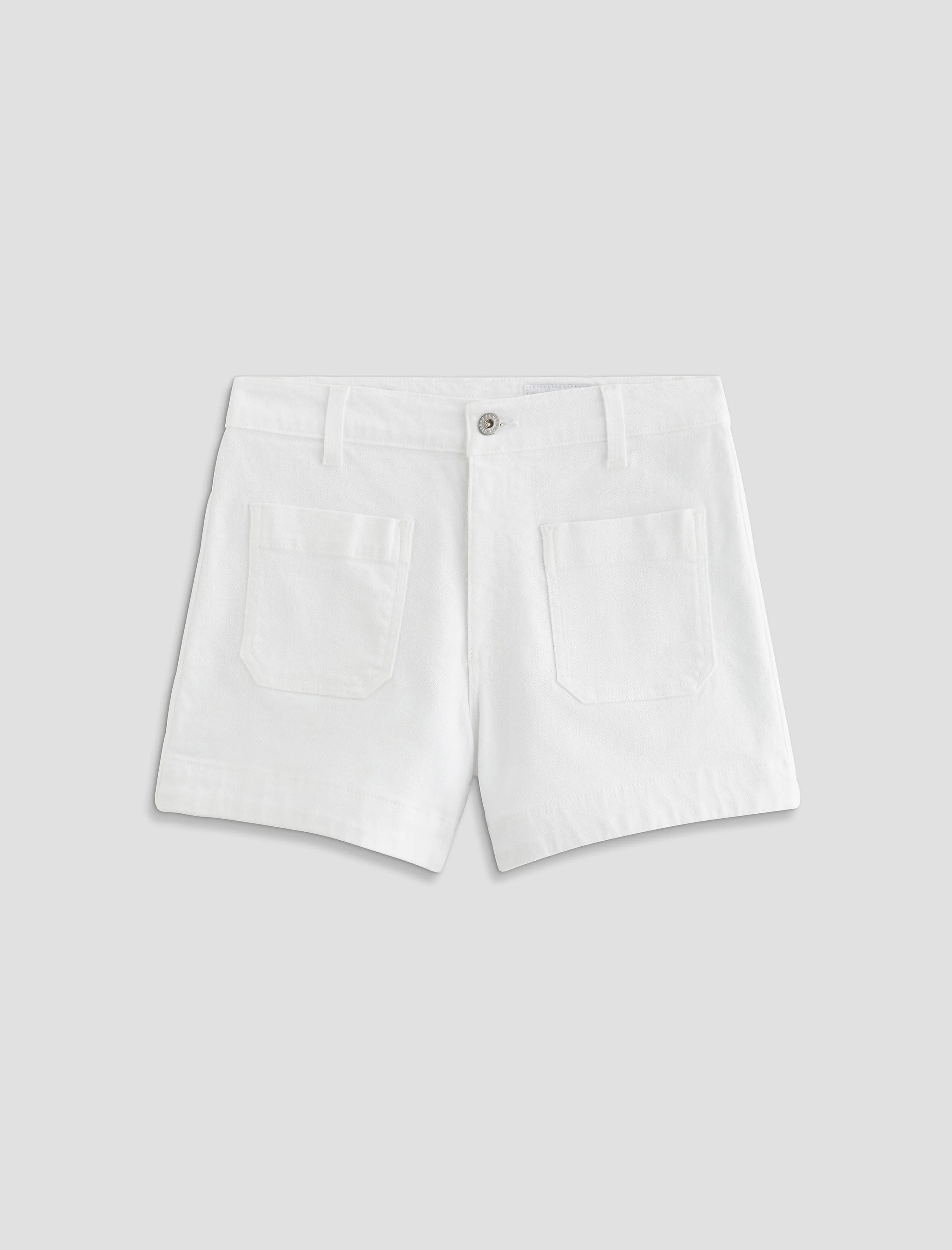 High-Waisted Utility The Daisy Short is a slim short made from Japanese 10 oz. Daytripper Stretch Raw Denim in white. Designed with comfort stretch and patch pockets, it offers a clean, tailored look with added ease for everyday wear. DETAILS & FIT Model is wearing size 26. - Front Rise: 10 3/4" - Bottom Opening: 23 1/2" - Inseam: 4" FABRIC & CARE Daytripper Stretch Raw Denim, 10 Oz. 72% Cotton, 26% Lyocell, 2% Elastane