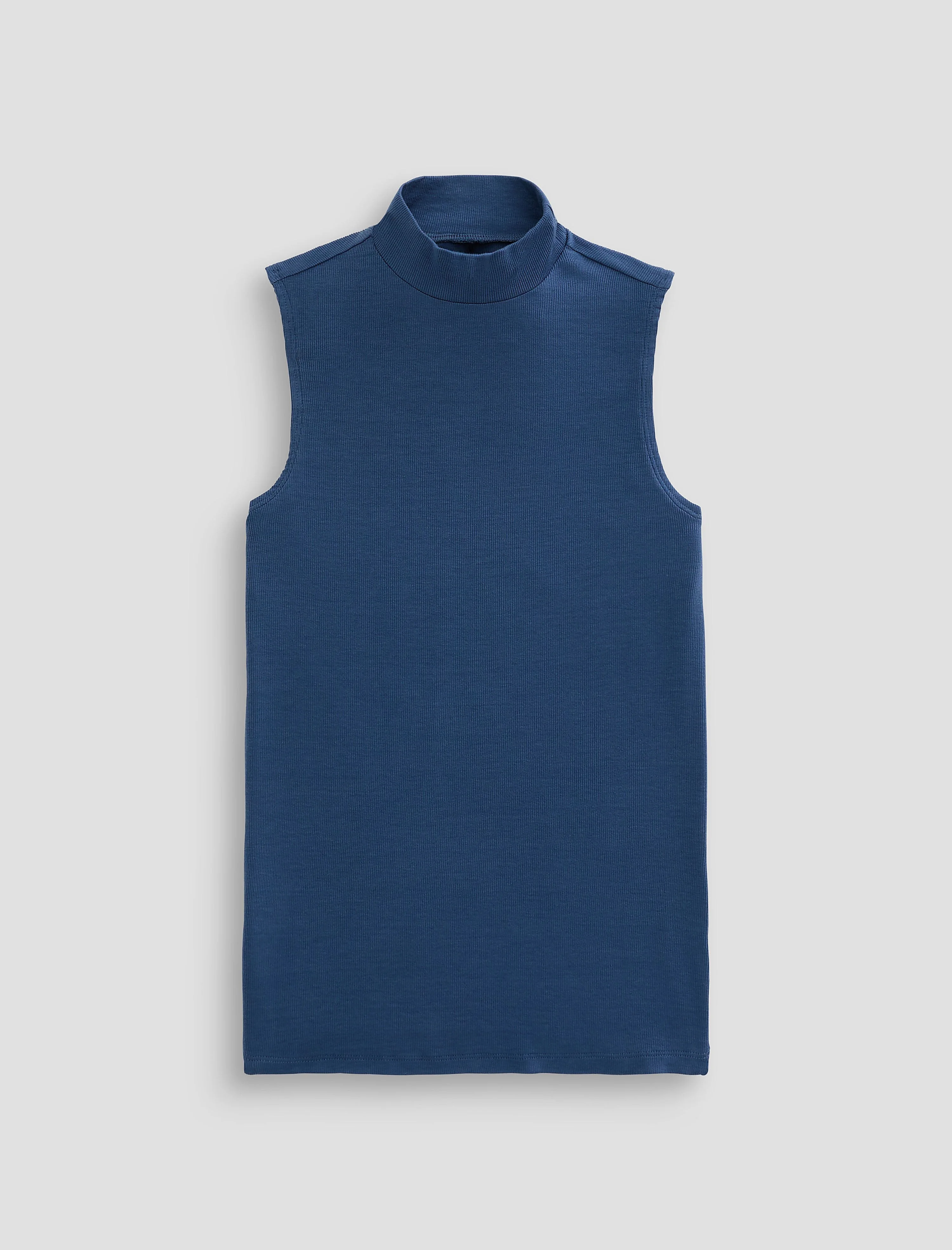 Slim Rib-Knit The Edie Sleeveless Turtleneck is an effortless addition to your capsule closet—wear it solo or layered. Made from a comfortable 2x1 rib knit that's soft against the skin, it's simple, understated, and layer-ready in a deep blue shade. Finished with seaming at the center back. DETAILS & FIT Model is wearing size S. - Body Length: 23" - Chest Width: 28 1/2 Neck Band Height: 1 1/2" FABRIC & CARE 2x1 Lyocell Rib, 96% Lyocell, 4% Spandex/Elastane