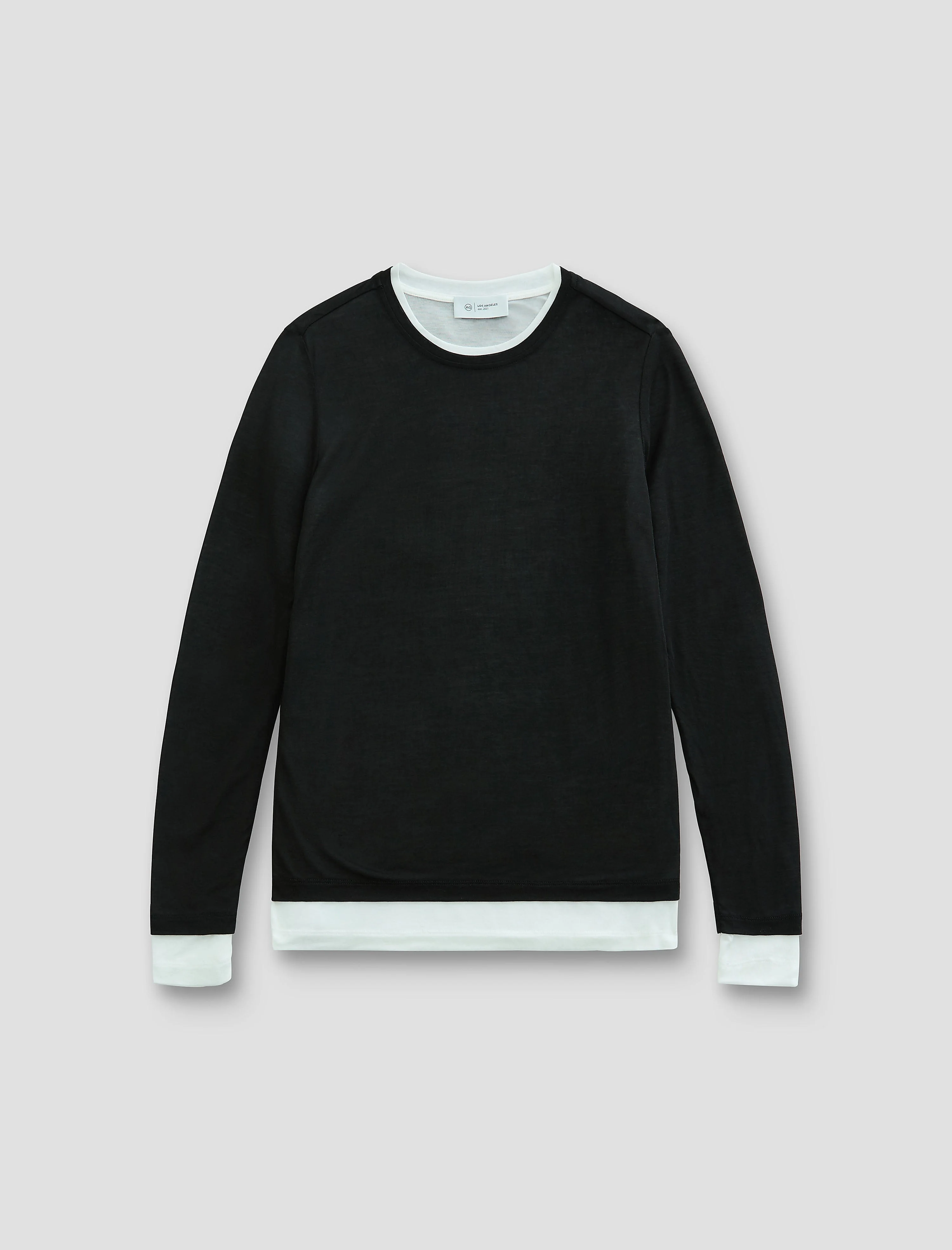Layered Long Sleeve Eleni is a layered top crafted from our tissue-weight jersey fabrication for superior softness and breathability without the bulk. Round neck, long sleeves, contrasting black on white style. DETAILS & FIT Model is wearing size S. - Body Length: 23" - Chest Width: 32" - Sleeve Length: 25 1/2" FABRIC & CARE Tissue Weight Jersey, 70% Lyocell, 30% Acetate