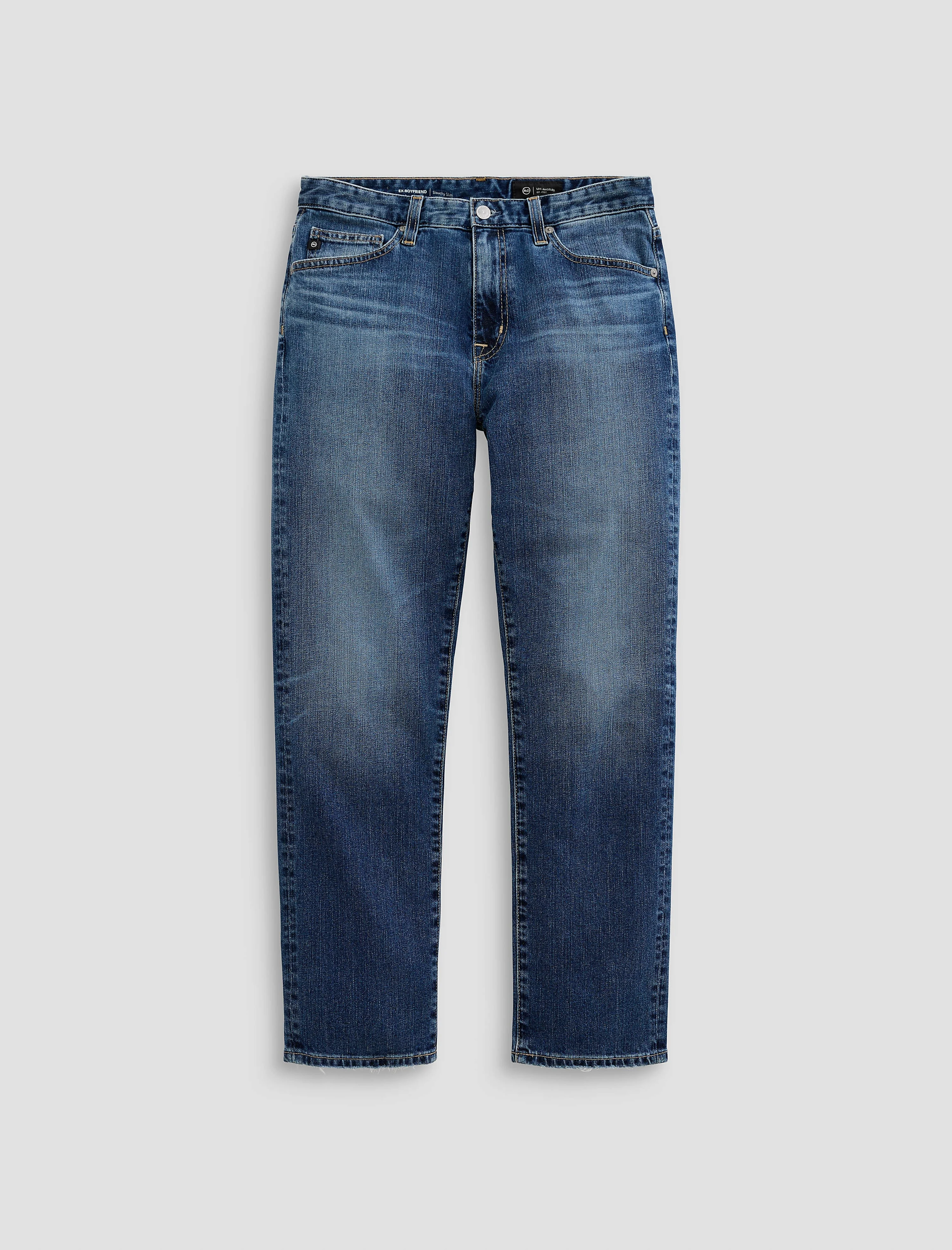 Slouchy Taper Ex-Boyfriend is a slouchy slim jean crafted in Lead Comfort Stretch Denim, a substantial yet stretchy denim. With a mid-rise that sits comfortably at the waist, this jean is favored for its relaxed fit from hip to knee and subtle taper at the leg opening for a flattering finish. Designed in our dark blue wash, Inspired Gaze, and finished with highs and lows, whiskering, fading, worn-down trim, and distressed hem. DETAILS & FIT Model is wearing size 26. - Front Rise: 10" - Knee Opening: 16" - Bottom Opening: 13 3/4" - Inseam: 28" FABRIC & CARE Lead Denim, 11 Oz. 98% Cotton, 2% Polyester