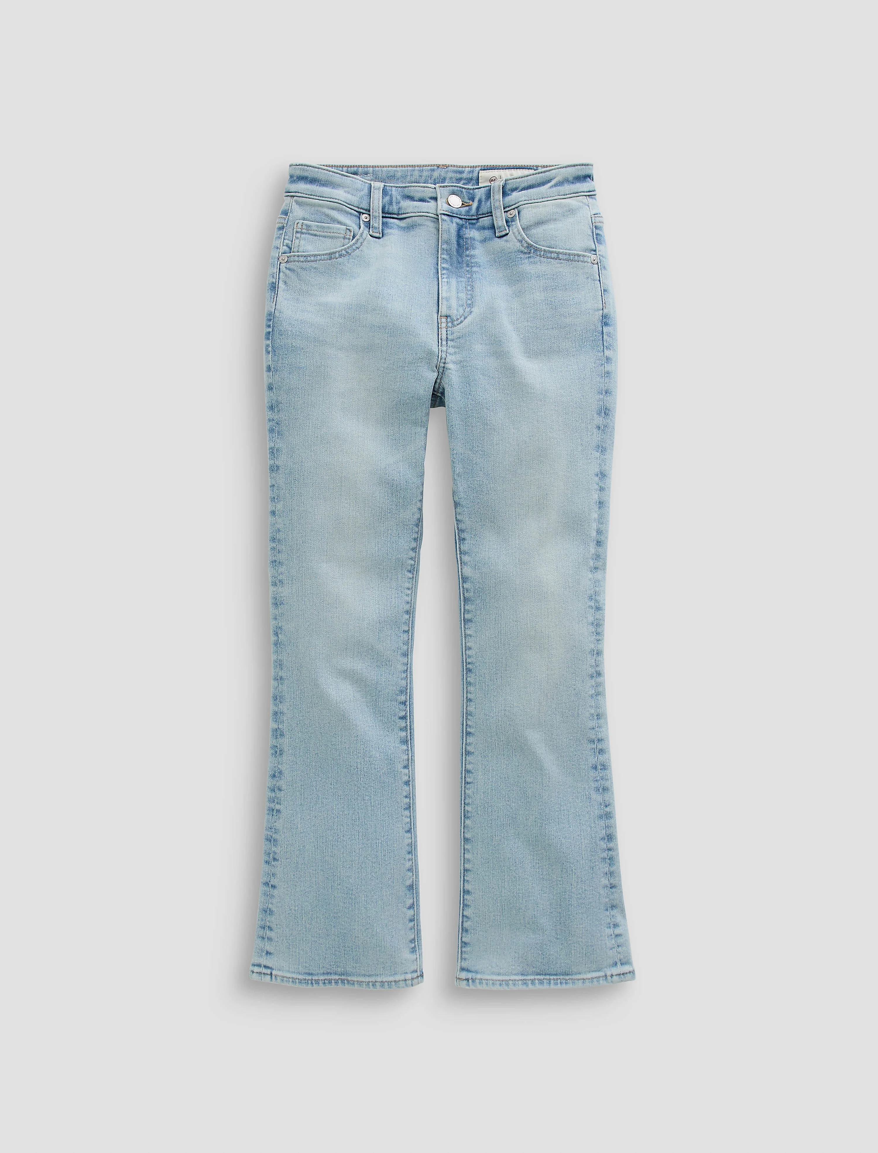 Mid-Rise Kick Flare Farrah Boot Crop is crafted from Power Stretch Denim. Cropped bootcut silhouette with a flattering, shape-enhancing fit, mid-rise, and flare starting from the knee. Designed in our light blue wash, 24 Years Intention, and finished to emulate 24 years of AG-ed™ wear through highs and lows, whiskering, and fading. DETAILS & FIT Model is wearing size 25. - Front Rise: 10" - Knee Opening: 14" - Bottom Opening: 18 1/2" - Inseam: 27" FABRIC & CARE Power Stretch Denim, 12 oz. 60% Cotton, 20% Recycled Cotton, 18% Polyester, 2% Elastane