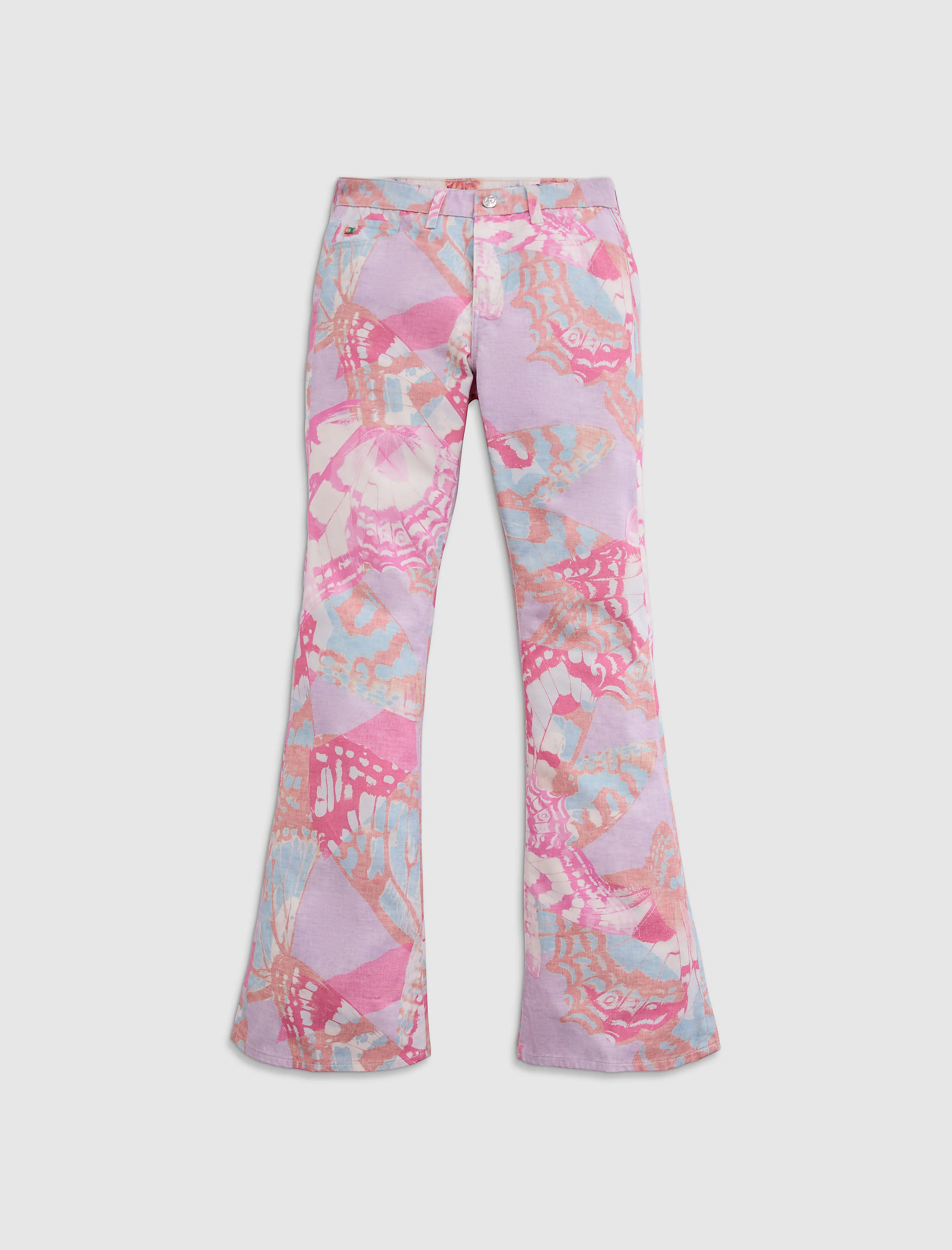 Sueded Sateen Mid-Rise Boot The Farrah Boot is a mid-rise bootcut jean with a skinny fit through the legs before opening into slightly flared hems. This pair comes in 8.4 oz. Sueded Stretch Sateen from Italy in a pink butterfly print. It features a soft, suede-like texture and breathable feel for your everyday comfort and style. DETAILS & FIT Model is wearing a size 26. - Front Rise: 10" - Knee Opening: 14" - Bottom Opening: 18 1/2" - Inseam: 32" FABRIC & CARE Sueded Stretch Sateen, 8.4 Oz. 97% Cotton, 3% Elastane