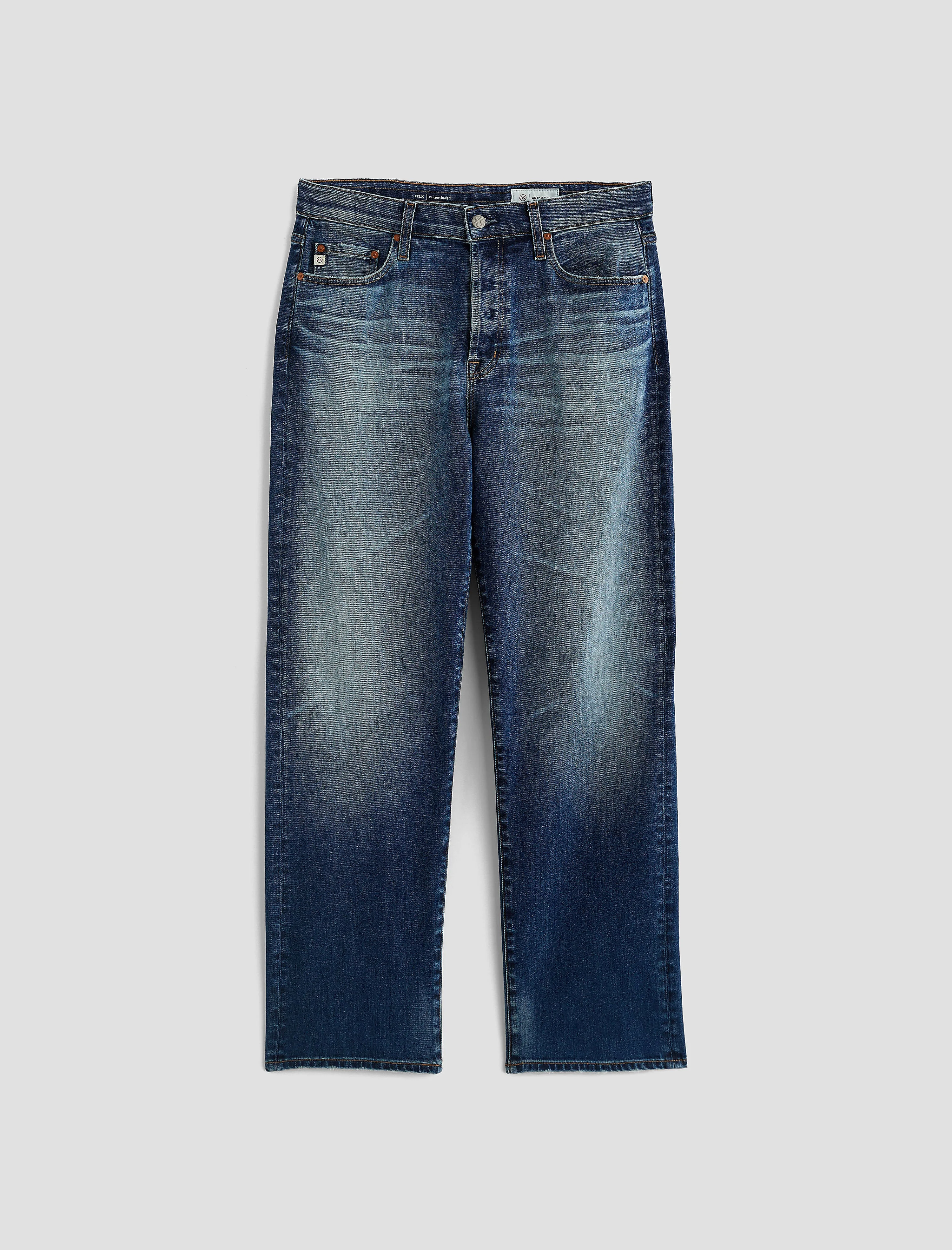 Vintage Straight Felix is a vintage 5-pocket straight-leg jean with a mid-rise fit, done in a dark AG-ed™ wash to replicate 10 years of authentic wear, that channels the look of well-worn denim. Made from 11.5 oz. Masaaki Comfort Stretch Denim, subtle fading, whiskering, and worn pocket edges give it a lived-in look. Designed to sit lower on the hips, so the length may feel longer than a standard 30" inseam. DETAILS & FIT Model is wearing size 32. - Front Rise: 12" - Knee Opening: 20" - Bottom Opening: 17" FABRIC & CARE Masaaki Comfort Stretch Denim, 11.5 Oz. 98% Cotton, 2% Elastane