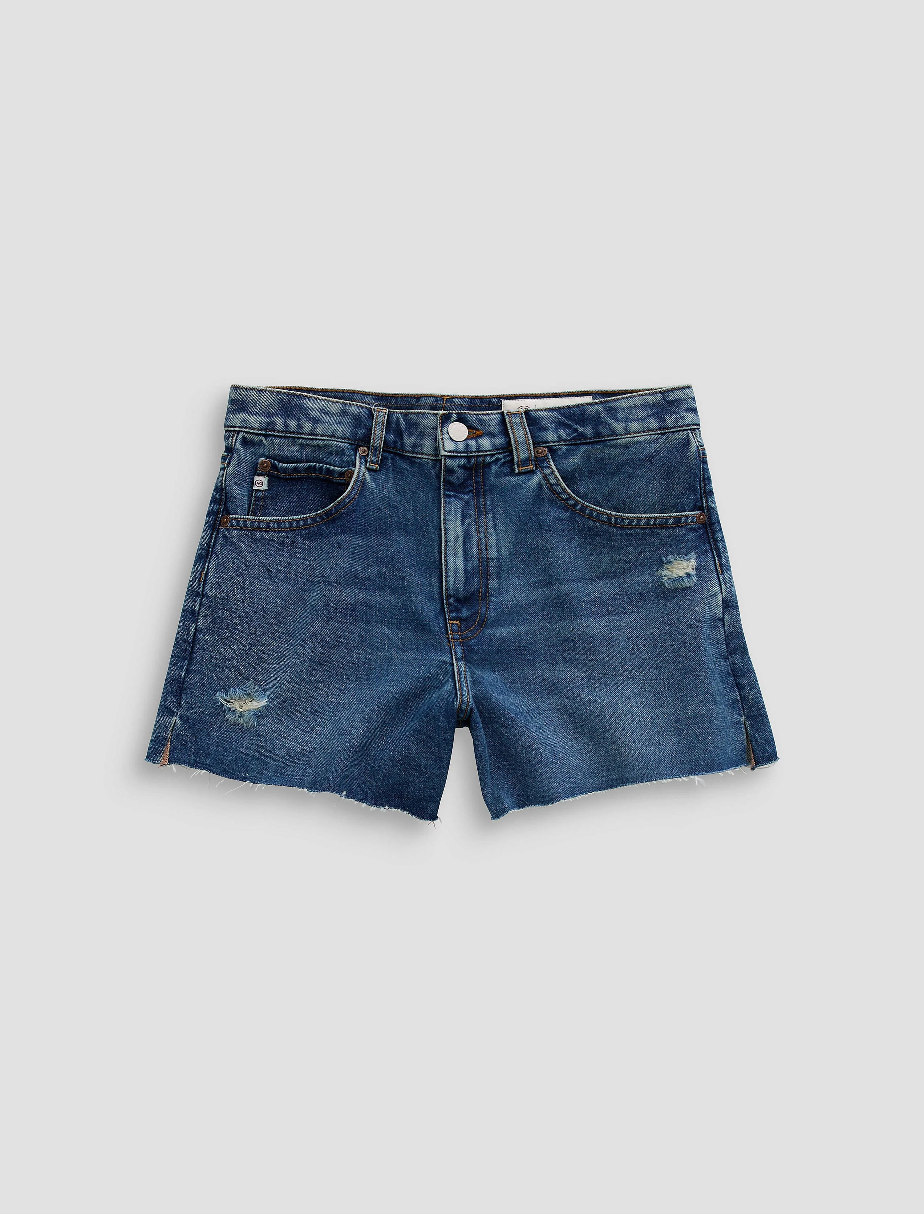 High-Rise Relaxed Short Halle is a high-rise short crafted from Premium Left Hand Denim. With a waist-defining silhouette and relaxed fit, this denim short pairs perfectly with everything from tucked-in tees to cropped tanks. Designed in our medium blue wash, 11 Years Enrich, and finished to emulate 11 years of AG-ed™ wear through front distressing, whiskering, fading, and vented raw-cut hem. DETAILS & FIT Model is wearing size 26. - Front Rise: 10 3/4" - Bottom Opening: 24" - Inseam: 4" FABRIC & CARE Premium Left Hand Denim, 13.4 oz. 80% Cotton, 20% Post Consumer Recycle Cotton