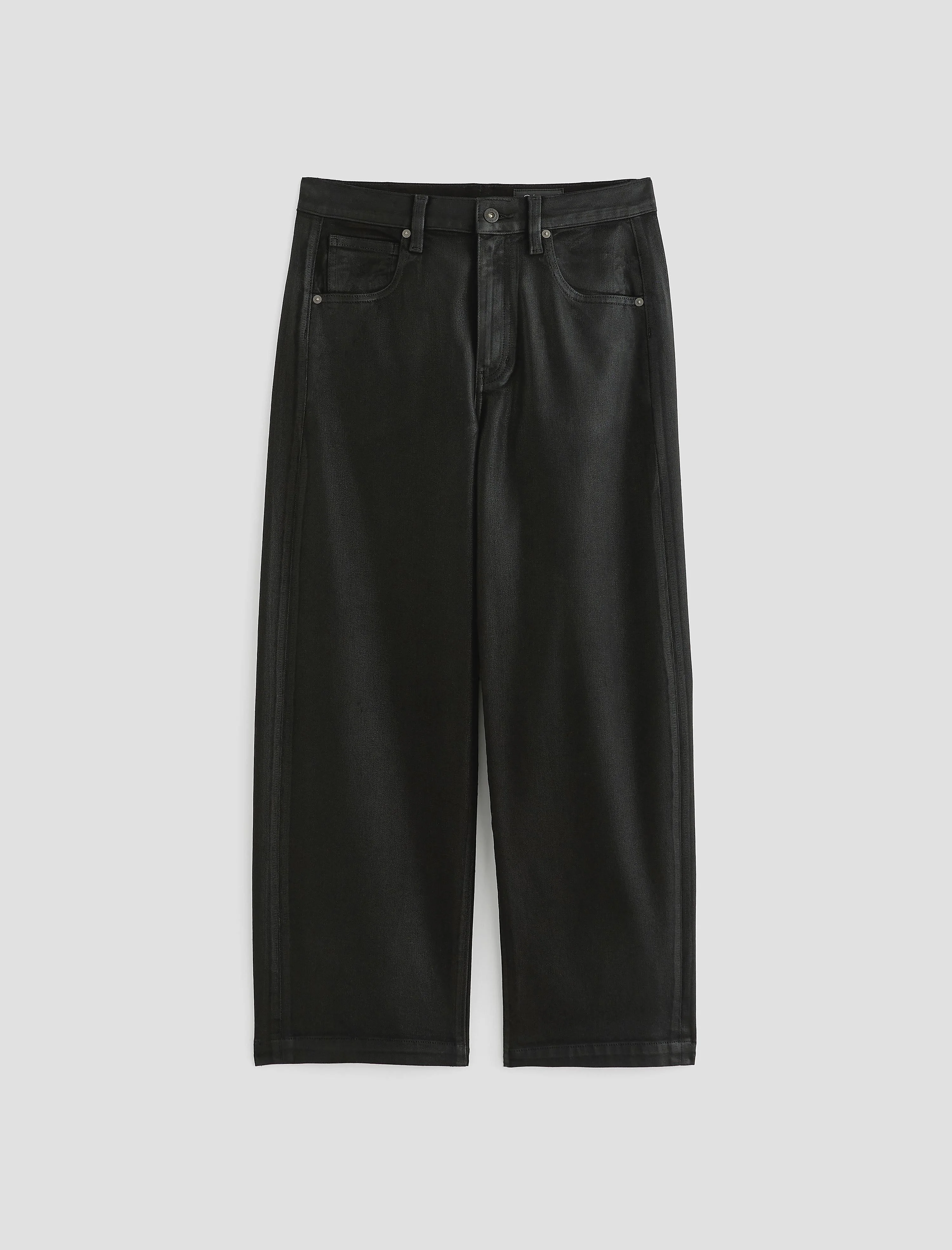 Coated Denim High-Rise Barrel The Hattie Crop is a high-rise barrel jean featuring a curved leg that tapers toward a cropped hem, hitting just above the ankle for a modern finish. Crafted from AG Cloud Soft Denim™ in a versatile black wash with a sheen coat that was hand-finished with an exclusive Leatherette process. DETAILS & FIT Model is wearing size 26. - Front Rise: 11 1/2" - Knee Opening: 22" - Bottom Opening: 18 3/4" - Inseam: 26 1/2" FABRIC & CARE AG Cloud Soft Denim™, Hyper Soft Bull Denim, 8.7 Oz. 93% Cotton, 6% Polyester, 1% Elastane