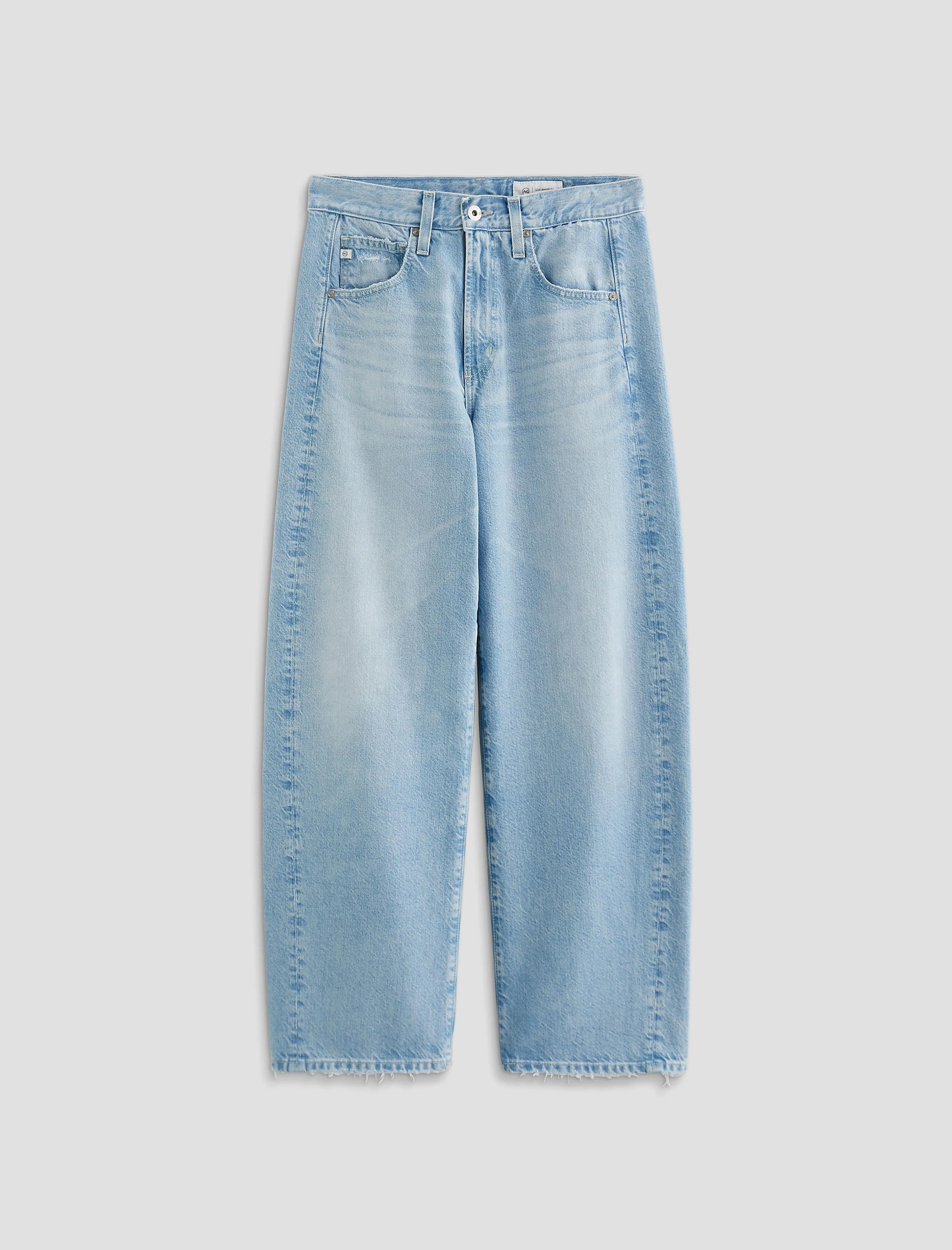 High-Rise Barrel The Hattie is a high-rise barrel jean with a 28” inseam and ankle-grazing frayed hems. Made from 12 oz. Drapey Ridged Denim in a light wash, this style offers a structured look with a comfortable stretch feel. DETAILS & FIT Model is wearing size 26. - Front Rise: 11 1/2" - Knee Opening: 22 1/4" - Bottom Opening: 18 3/4" - Inseam: 28" FABRIC & CARE Drapey Rigid, Denim, 12 Oz. 82% Cotton, 18% Lyocell