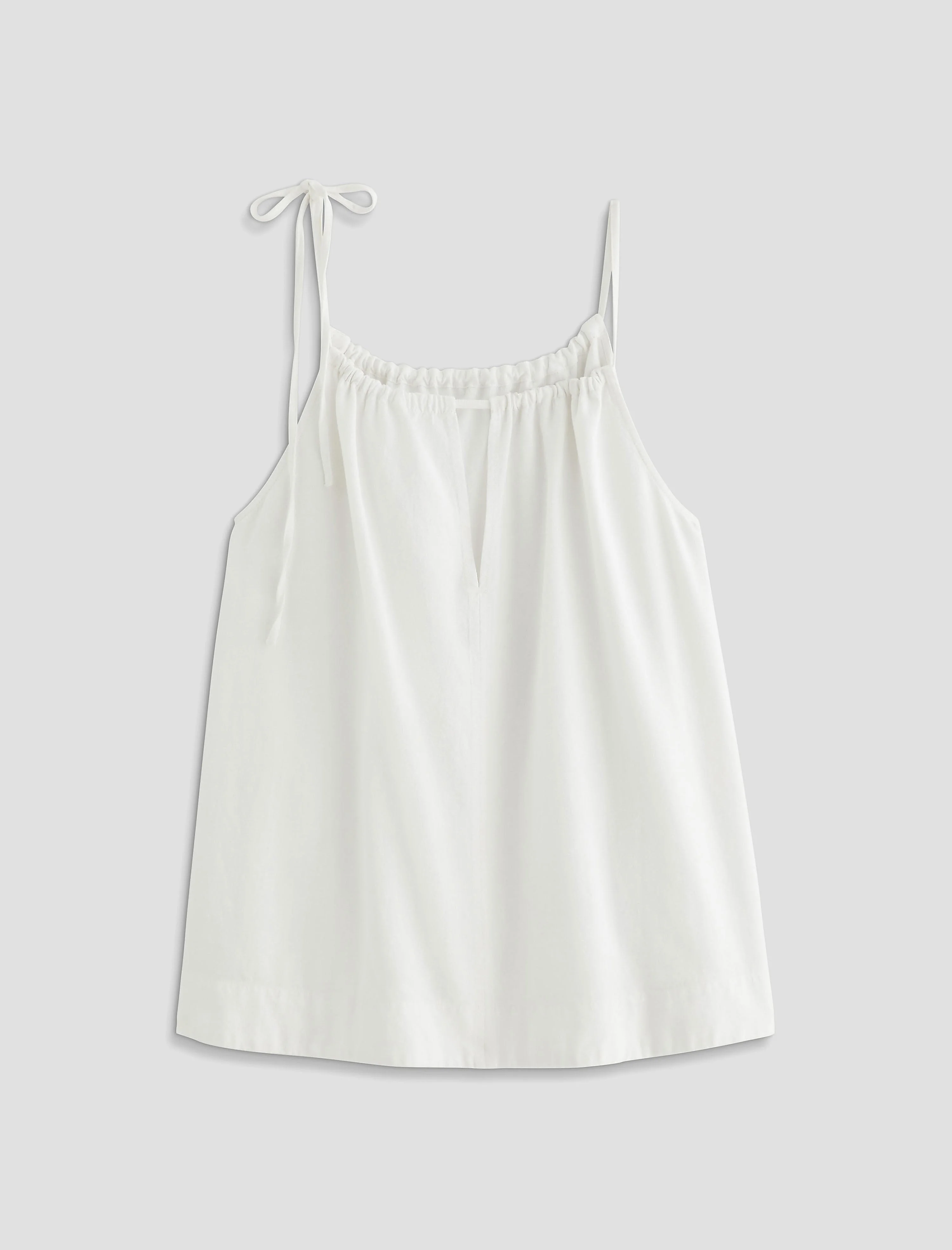 Gathered Stretch Linen Our women’s Ivy Tank is a sleeveless swing tank made from easy comfort linen. Available in white, it offers a lightweight feel and relaxed fit—perfect for warm-weather dressing. DETAILS & FIT Model is wearing size S. - Body Length: 21 1/2" - Chest Width: 35 1/2" FABRIC & CARE Easy Stretch Linen, 80% Rayon, 20% Linen