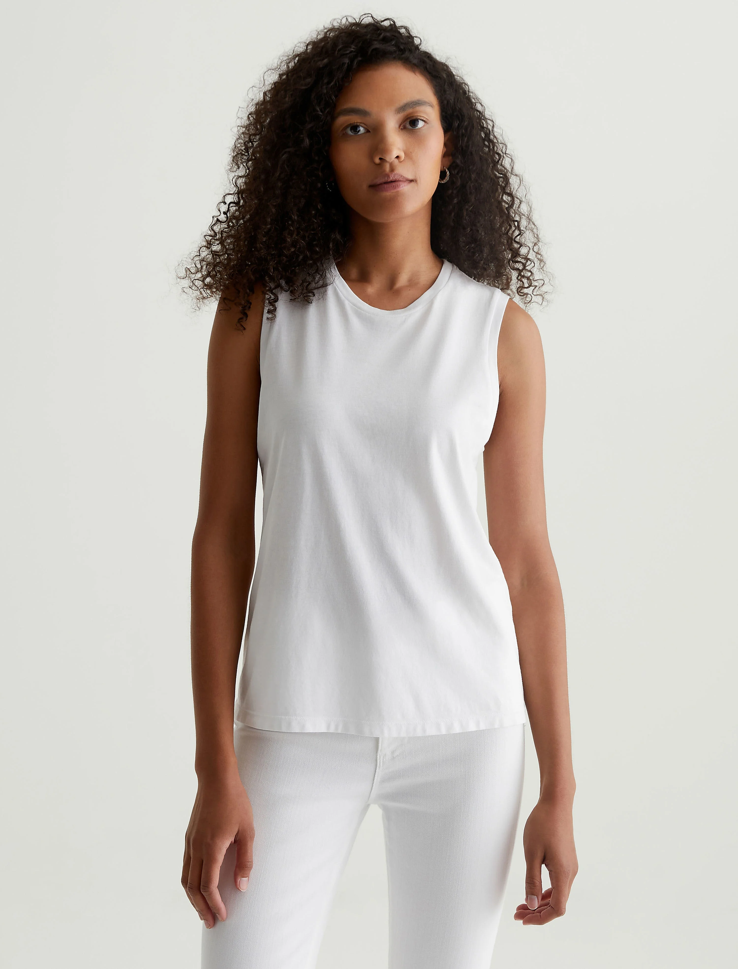 Classic Sleeveless Tee Our Jagger Muscle Tank in white is the perfect sleeveless muscle tank for all year round, cut with a higher arm hole to be worn alone or under jackets and blazers. The 1X1 rib neckband makes this a classic—yet it still feels modern, casual, and cool in its silhouette. Our Jersey Knit offers a luxurious comfort that is unrivaled—knitted with both S-twist and Z-twist yarn to sustain longevity and stability, preventing unnecessary twisting and torquing. During the production process, the S-twist yarn is spun counter-clockwise creating a right-handed twill. The Z-twist yarn works in opposition, spinning clockwise for a left-handed twill. This opposition—when working together—yields a softer, more durable fabrication and gives strength to the yarn making it more difficult to pull apart. Designed in 100% Cotton DETAILS & FIT Model is wearing size S. - Body Length: 26" - Chest Width: 36" FABRIC & CARE Essential Light Jersey, 4.5 Oz. 100% Cotton