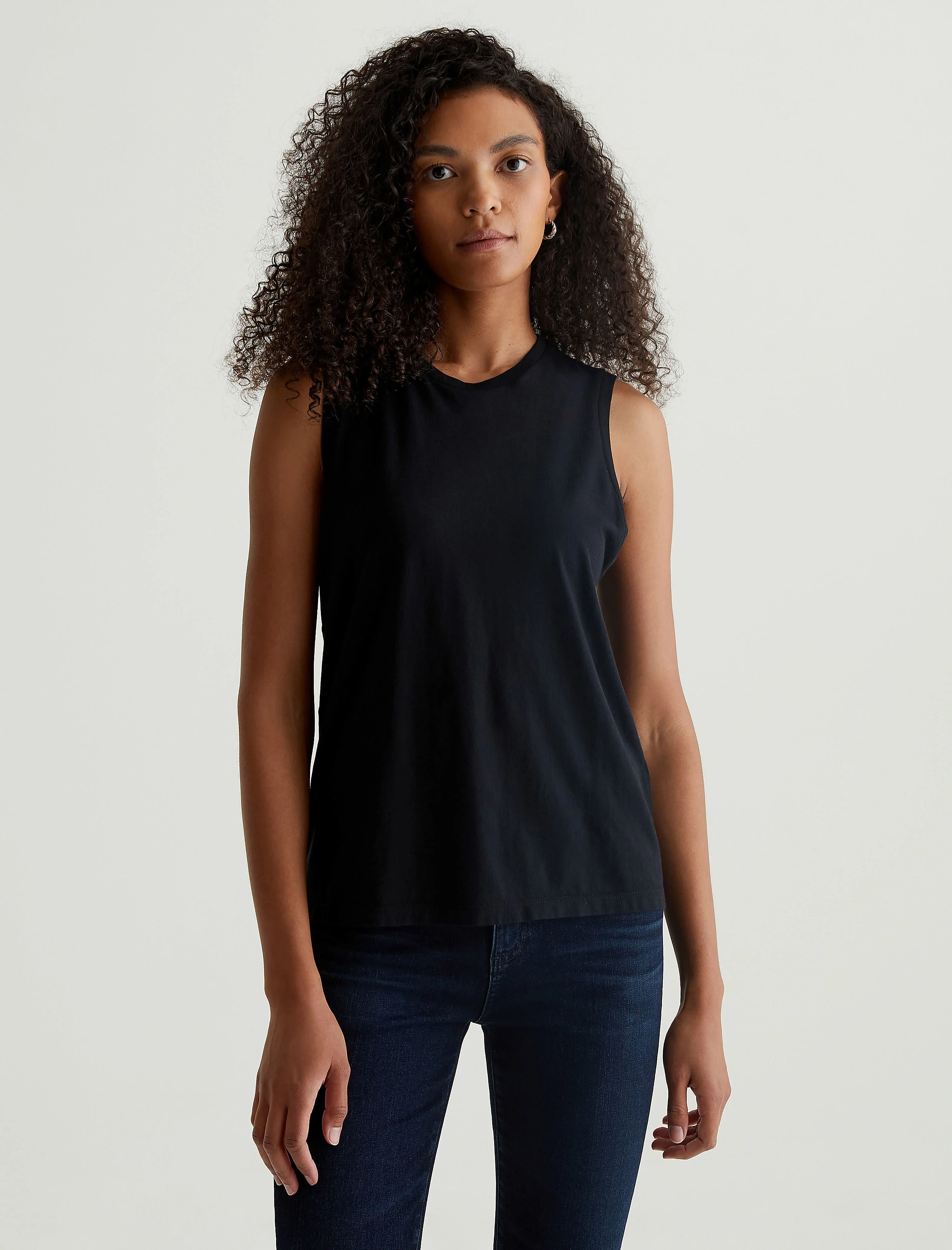 Classic Sleeveless Tee Our Jagger Muscle Tank in black is the perfect sleeveless muscle tank for all year round, cut with a higher arm hole to be worn alone or under jackets and blazers. The 1X1 rib neckband makes this a classic—yet it still feels modern, casual, and cool in its silhouette. Our Jersey Knit offers a luxurious comfort that is unrivaled—knitted with both S-twist and Z-twist yarn to sustain longevity and stability, preventing unnecessary twisting and torquing. During the production process, the S-twist yarn is spun counter-clockwise creating a right-handed twill. The Z-twist yarn works in opposition, spinning clockwise for a left-handed twill. This opposition—when working together—yields a softer, more durable fabrication and gives strength to the yarn making it more difficult to pull apart. Designed in 100% Cotton DETAILS & FIT Model is wearing size S. - Body Length: 26" - Chest Width: 36" FABRIC & CARE Essential Light Jersey, 4.5 Oz. 100% Cotton