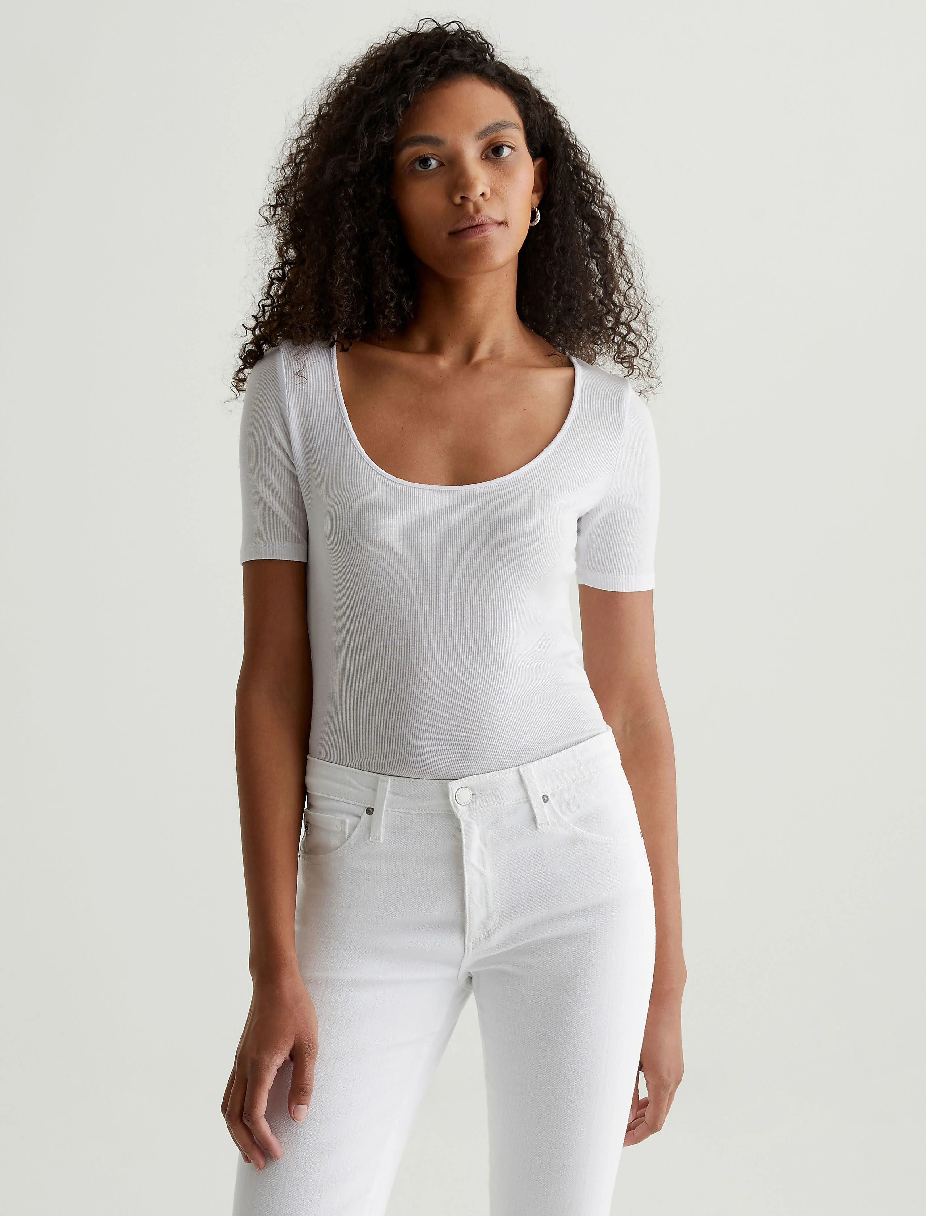 Fitted Scoop Neck The Jaxon Scoop for women is a fitted short-sleeve tee with a scoop neckline edged by slim self-binding. Made from an eco-friendly 2x1 Lyocell Rib fabrication in bright, clean white, it's luxuriously soft and comfortable. DETAILS & FIT Model is wearing size S. - Body Length: 22 3/4" - Sleeve Length: 8 3/8" - Chest Width: 29 3/4" FABRIC & CARE 2x1 Lyocell Rib, 96% Lyocell, 4% Spandex/Elastane