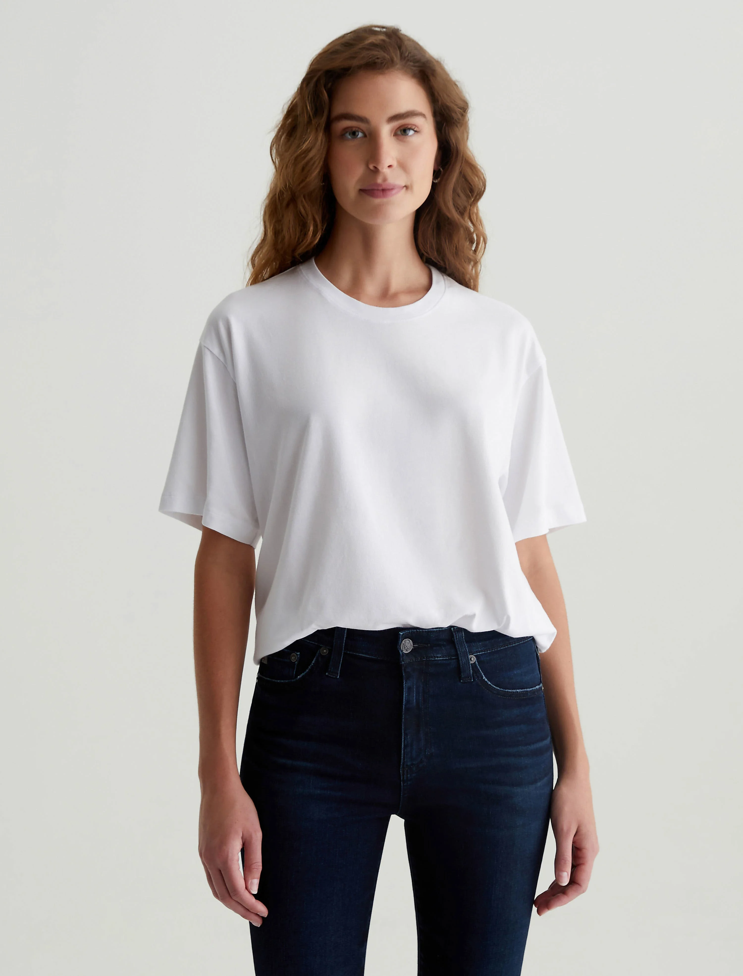 Oversized Crew Neck The Karter Ex-Boyfriend S/S Crew in white is our first introduction to a relaxed fit short sleeve crew. Drop shoulders creates a modern, oversized take on the “borrowed from your boyfriend” look. Our Jersey Knit offers a luxurious comfort that is unrivaled—knitted with both S-twist and Z-twist yarn to sustain longevity and stability, preventing unnecessary twisting and torquing. During the production process, the S-twist yarn is spun counter-clockwise creating a right-handed twill. The Z-twist yarn works in opposition, spinning clockwise for a left-handed twill. This opposition—when working together—yields a softer, more durable fabrication and gives strength to the yarn making it more difficult to pull apart. Designed in 100% Cotton. DETAILS & FIT Model is wearing size S. - Body Length: 24" - Sleeve Length: 7 3/4" - Chest Width: 40" FABRIC & CARE Essential Light Jersey, 4.5 Oz. 100% Cotton