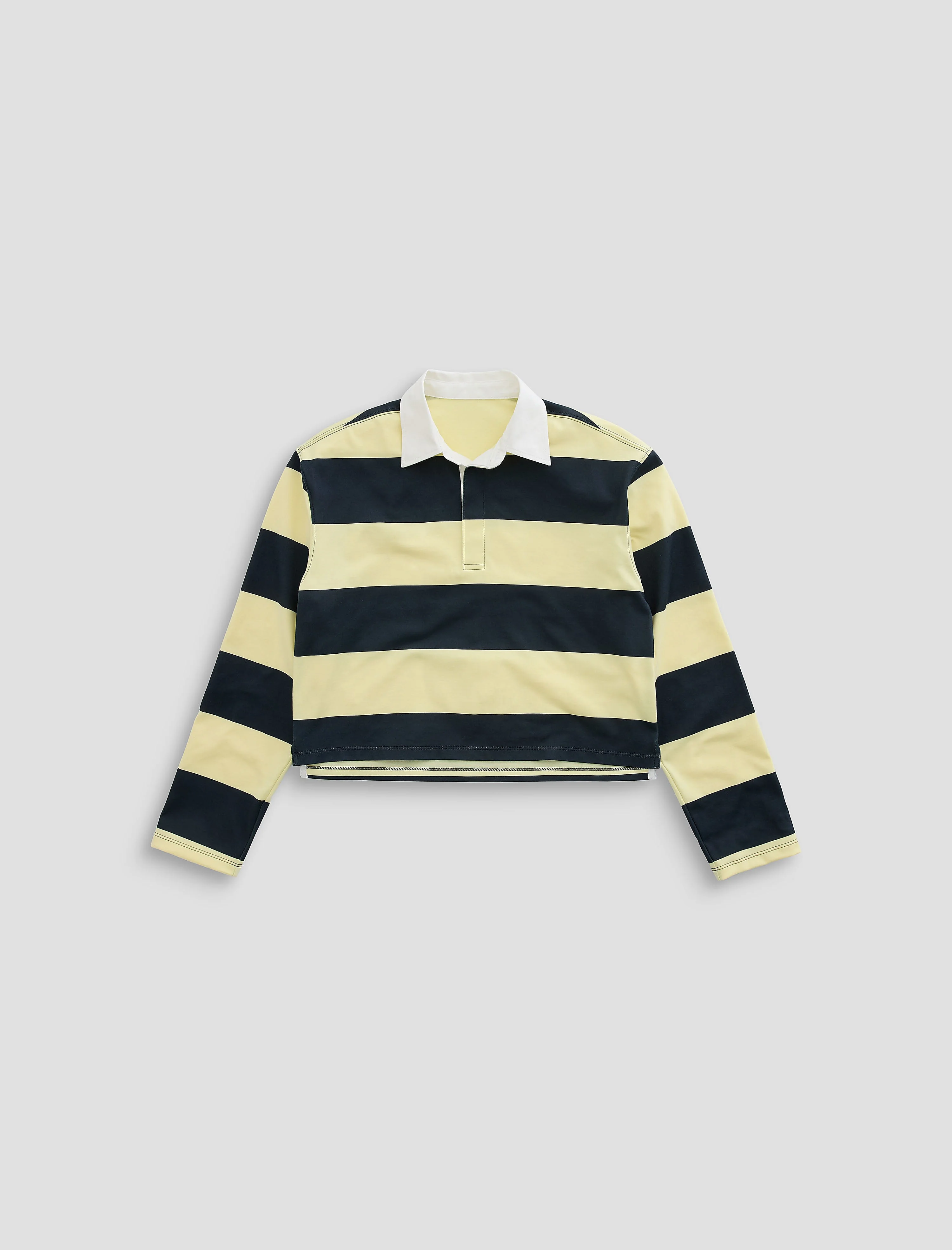 Rugby Shirt Londyn is a classic rugby shirt knitted from heavy 100% cotton jersey. This preppy vintage callback is complemented by bold yellow and navy stripes as well as a contrasting collar. Designed to sit above the waistband, Londyn is finished with a discreet button placket for a polished look. DETAILS & FIT Model is wearing size S. - Body Length: 20 1/2" - Chest Width: 40" - Sleeve Length: 23 1/2" FABRIC & CARE Heavy Cotton Jersey, 100% Cotton