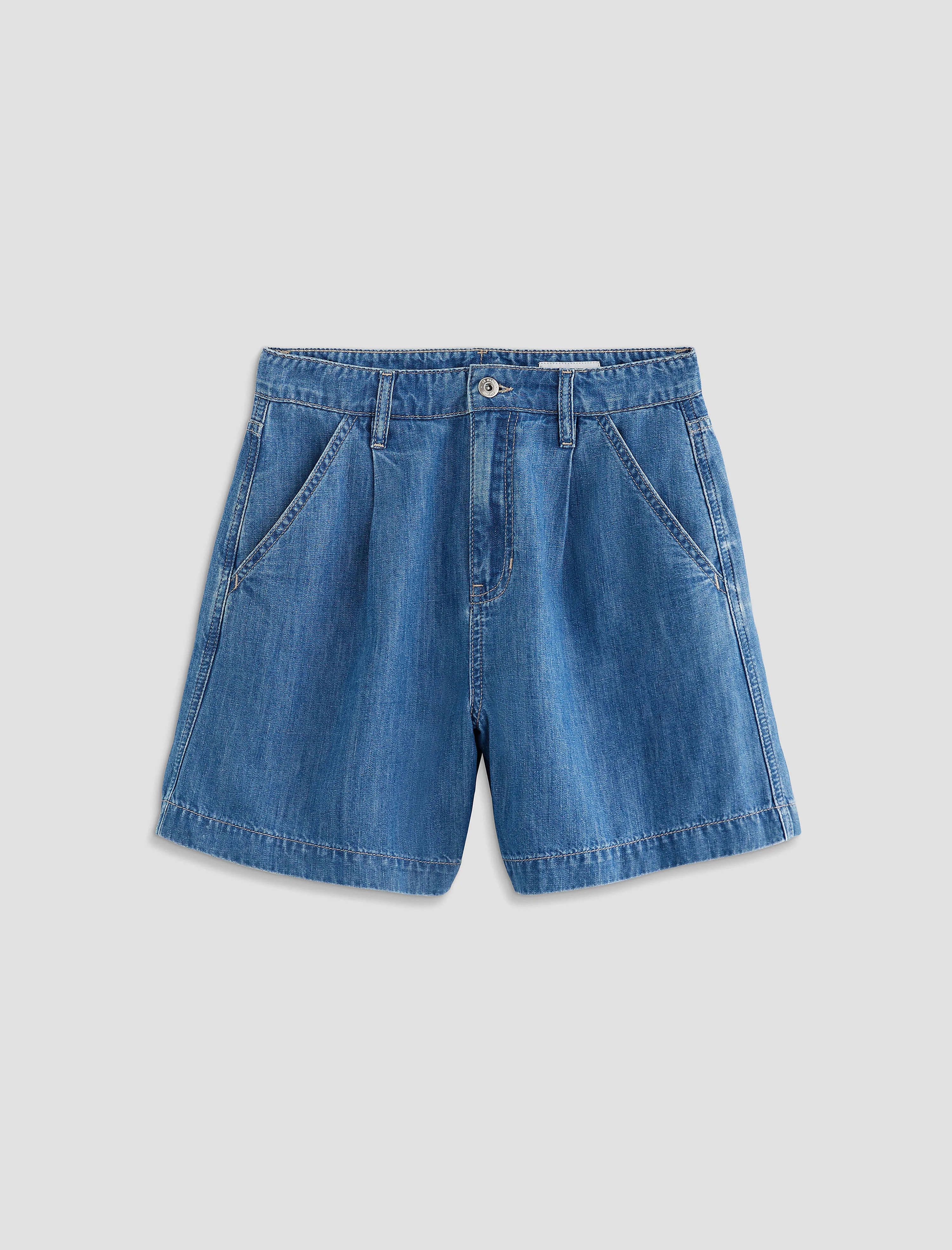 Pleated High-Rise The Mandy Short is a high-rise style crafted from non-stretch Scarlett Irisblue Chambray in a medium blue wash. Designed with trouser pockets and clean stitched hems for a polished, structured look. DETAILS & FIT Model is wearing size 26. - Front Rise: 12 1/2" - Bottom Opening: 25 1/2" - Inseam: 6" FABRIC & CARE Scarlett Irisblue Chambray, 67% Cotton, 19% Linen (Flax), 14% Lyocell