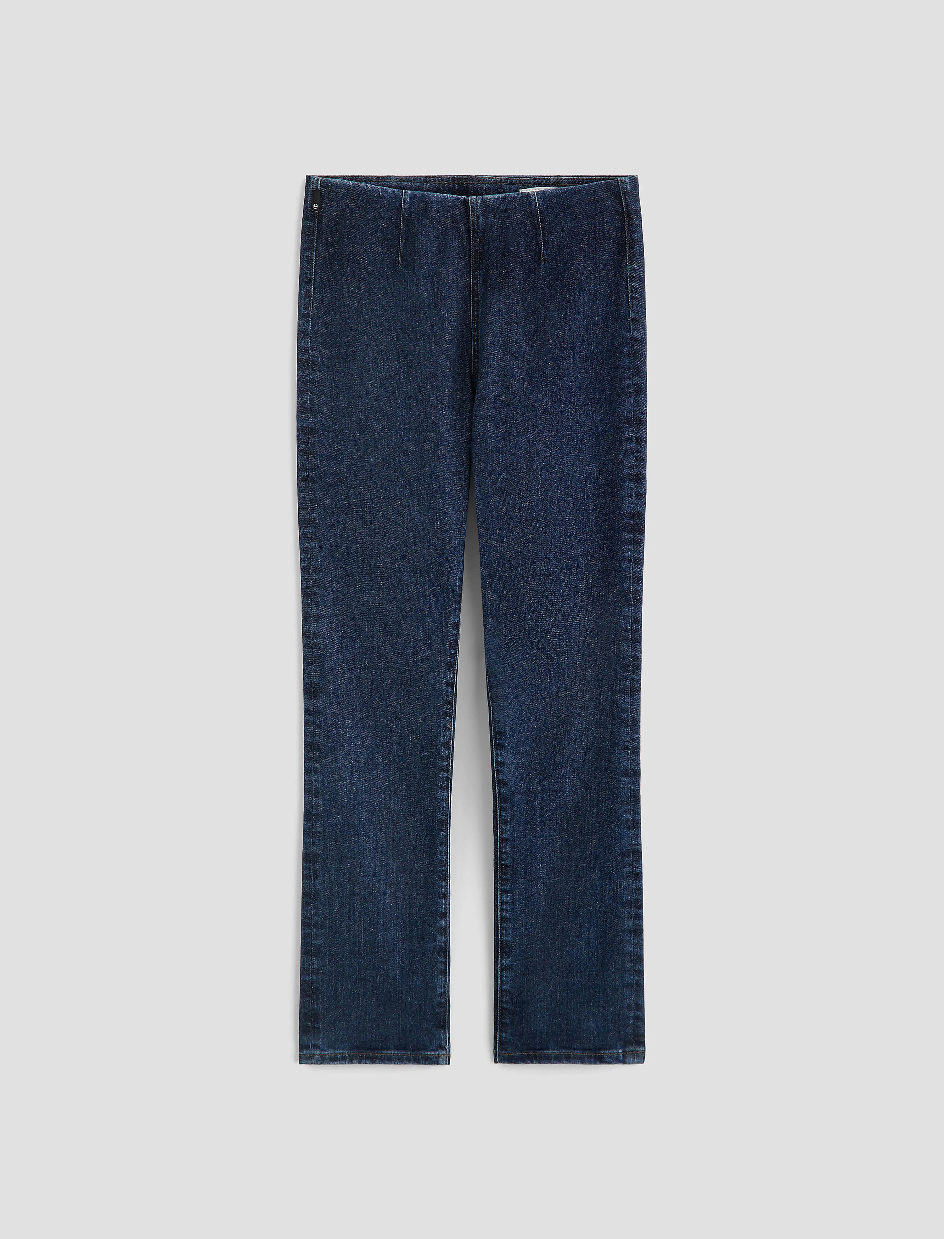 Pull On Mid-Rise Slim Straight Our new pull-on version of the Mari Crop is crafted without hardware for total comfort. This mid-rise slim straight is designed to fit easy around the hips and finishes with a cropped leg opening. Done here in 13 oz. Indigo Ultra Stretch Denim from Japan, it's got a soft feel and a clean, dark wash. DETAILS & FIT Model is wearing size 26. - Front Rise: 9 3/4" - Knee Opening: 14" - Bottom Opening: 13" - Inseam: 27" FABRIC & CARE Indigo Ultra Stretch Denim, 13 Oz. 68% Cotton, 22% Lyocell, 10% Spandex/Elastane