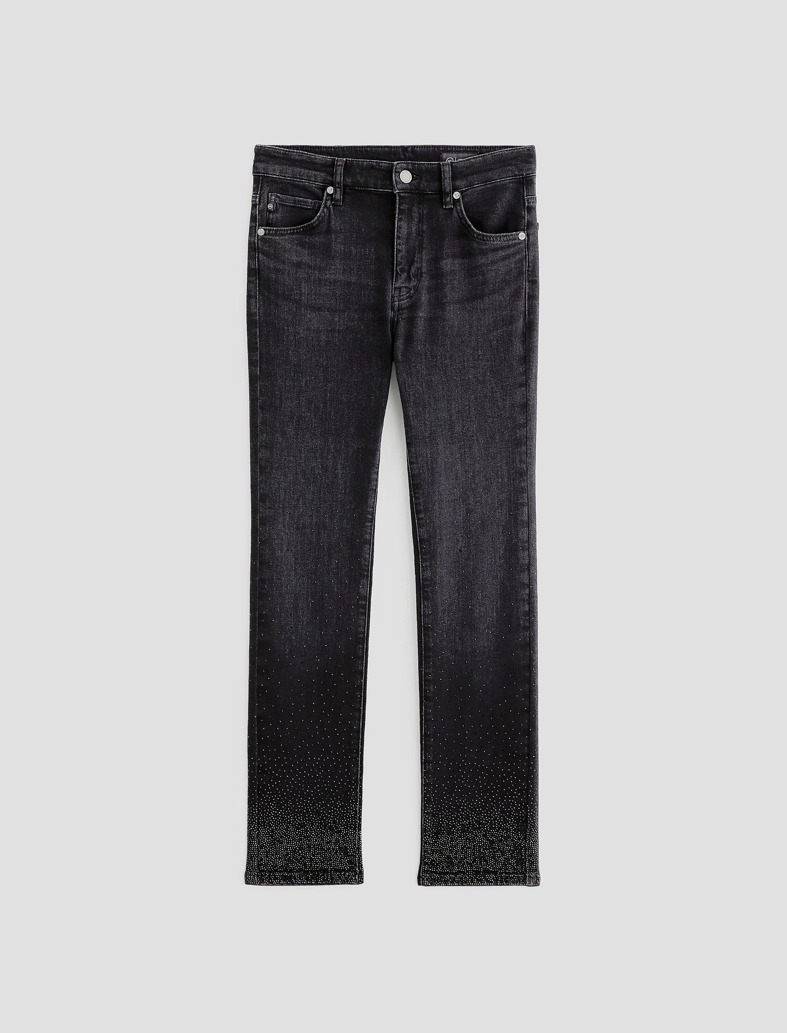 Mid-Rise Slim Straight The Mari is a mid-rise slim straight jean cut to flatter with clean, leg-elongating lines. Features an easy fit around the hips with a straight silhouette that tapers just the right amount. Crafted from 9.3 oz. Midnight Comfort Stretch denim, it is adorned with a constellation of black rhinestones at the hem, adding subtle flair to any outfit. This is an embellished style, please wear with care. DETAILS & FIT Model is wearing size 26. - Front Rise: 9 3/4" - Knee Opening: 14" - Bottom Opening: 13" - Inseam: 29" FABRIC & CARE Midnight Comfort Stretch, 9.3 oz. 99% Cotton, 1% Elastane