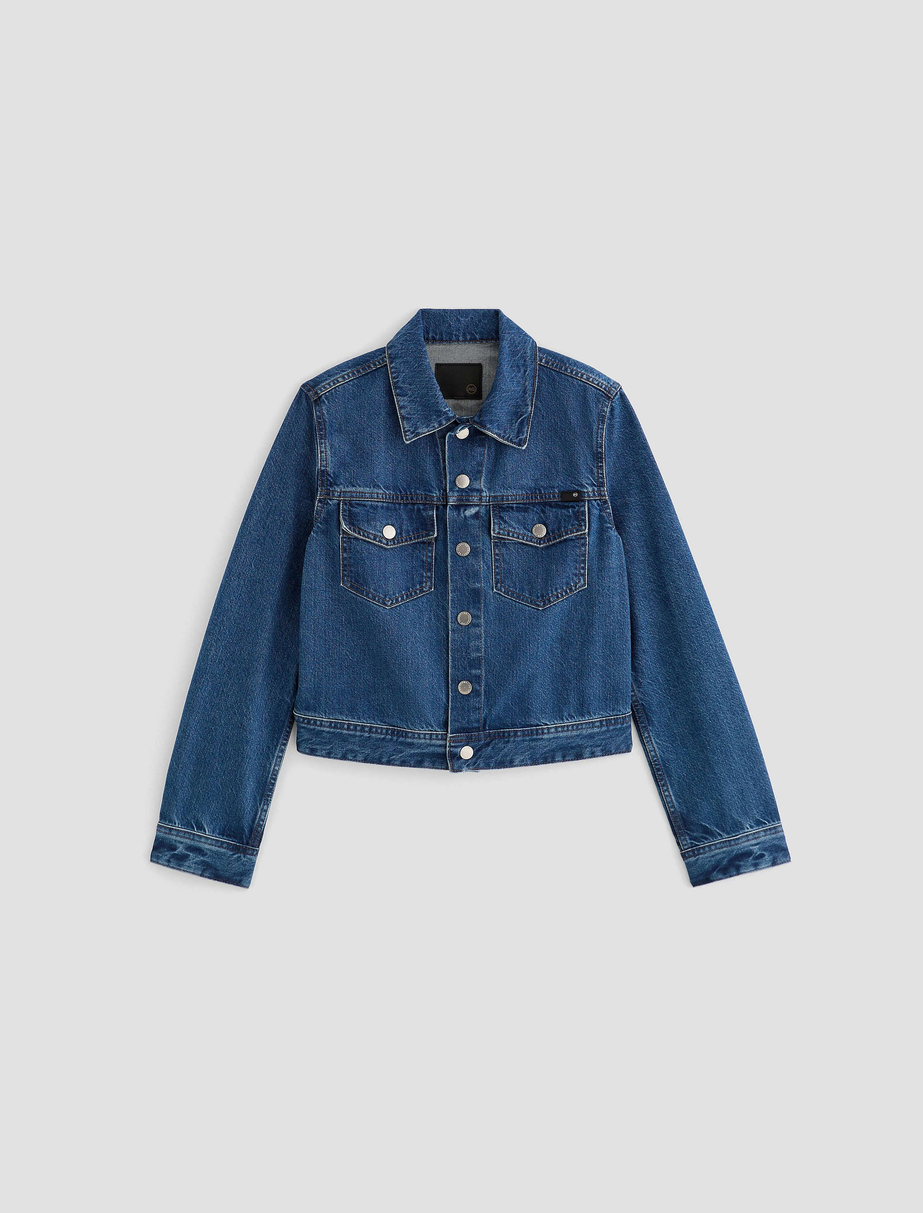 Cropped Trucker The Molly is a slightly boxy trucker that sits right above your belly button, crafted from non-stretch denim. Designed with a classic long-sleeve design, it offers a structured fit with timeless appeal. The Molly perfectly pairs back to your skirt or jean for a meet and greet situation at the navel. DETAILS & FIT Model is wearing size S. - Body Length: 17" - Chest Width: 38 3/4" - Sleeve Length: 24" FABRIC & CARE Drapey Rigid, Denim, 12 Oz. 82% Cotton, 18% Lyocell