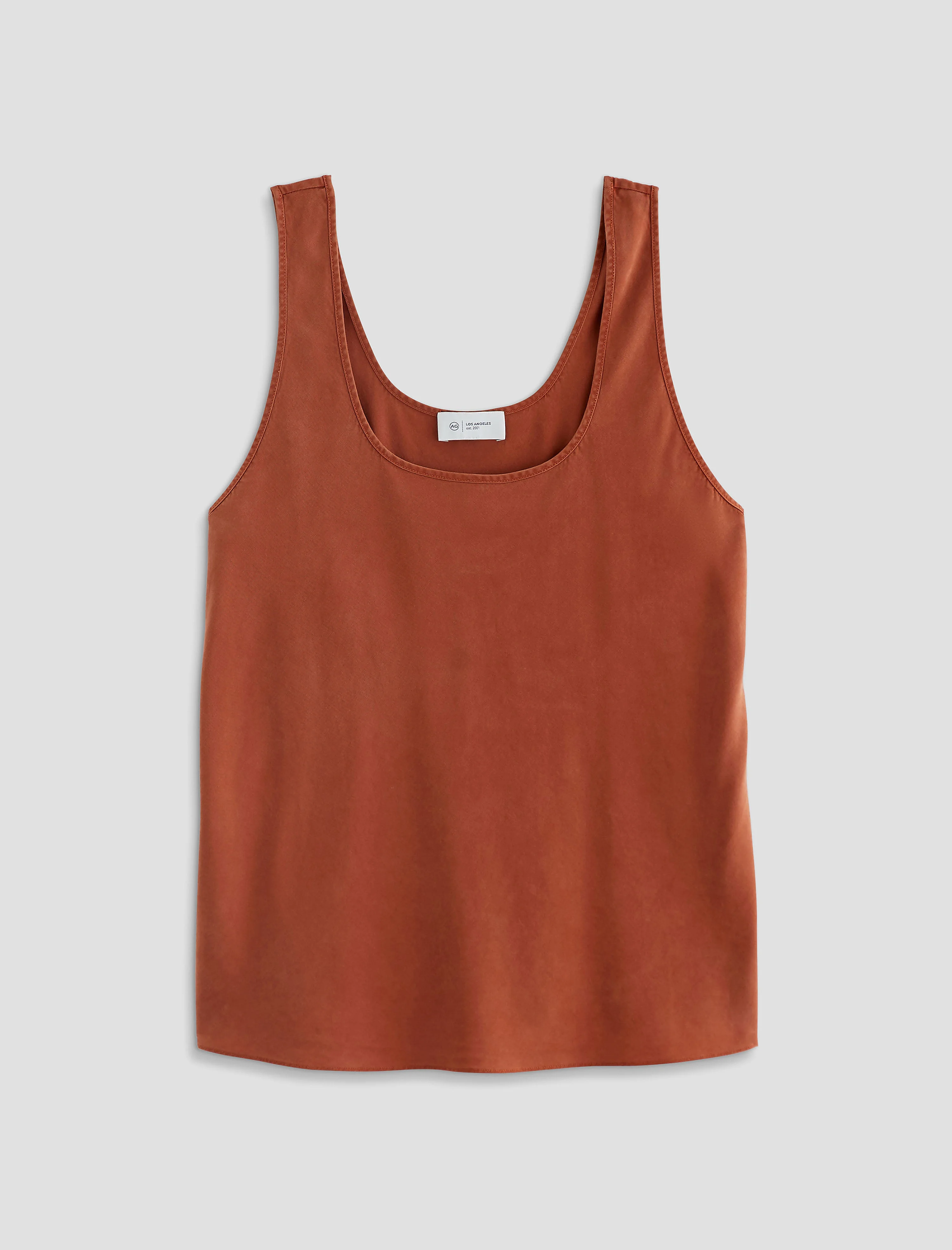 Breezy Loose Fit The Nicola is a sleeveless double scoop tank crafted from Easy Tencel Twill in a vibrant orange shade. Designed with a loose fit, it’s offers a breezy silhouette. DETAILS & FIT Model is wearing size S. - Body Length: 24" - Chest Width: 39 1/2" FABRIC & CARE Easy Tencel Twill, 100% Tencel