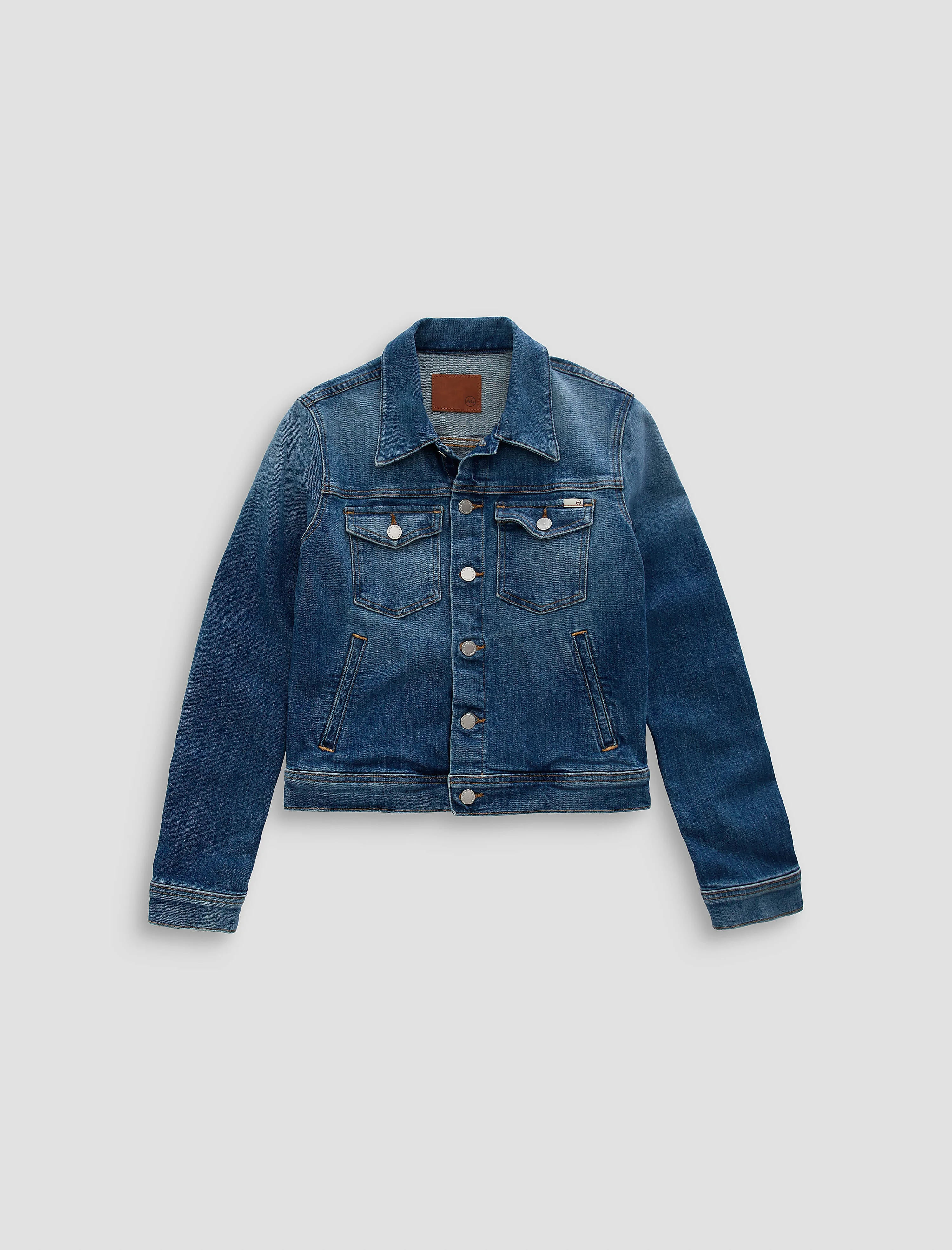 Slim Trucker Robyn is a cropped workwear jacket crafted in Comfort Stretch Journey Denim from the renowned Candiani Mill in Italy. Slim fit, updated with adjustable waist tabs, chest flap pockets, and welt front pockets. Detailed with debossed metal buttons and logo on the chest flap pocket. Designed in our dark blue wash, 10 Years Illiad, and finished to emulate 10 years of AG-ed™ wear through front distressing, highs and lows, and fading. DETAILS & FIT Model is wearing size S. - Body Length: 18" - Chest Width: 35" - Sleeve Length: 24" FABRIC & CARE Journey Denim, 11 Oz. 98% Cotton, 2% Elastane