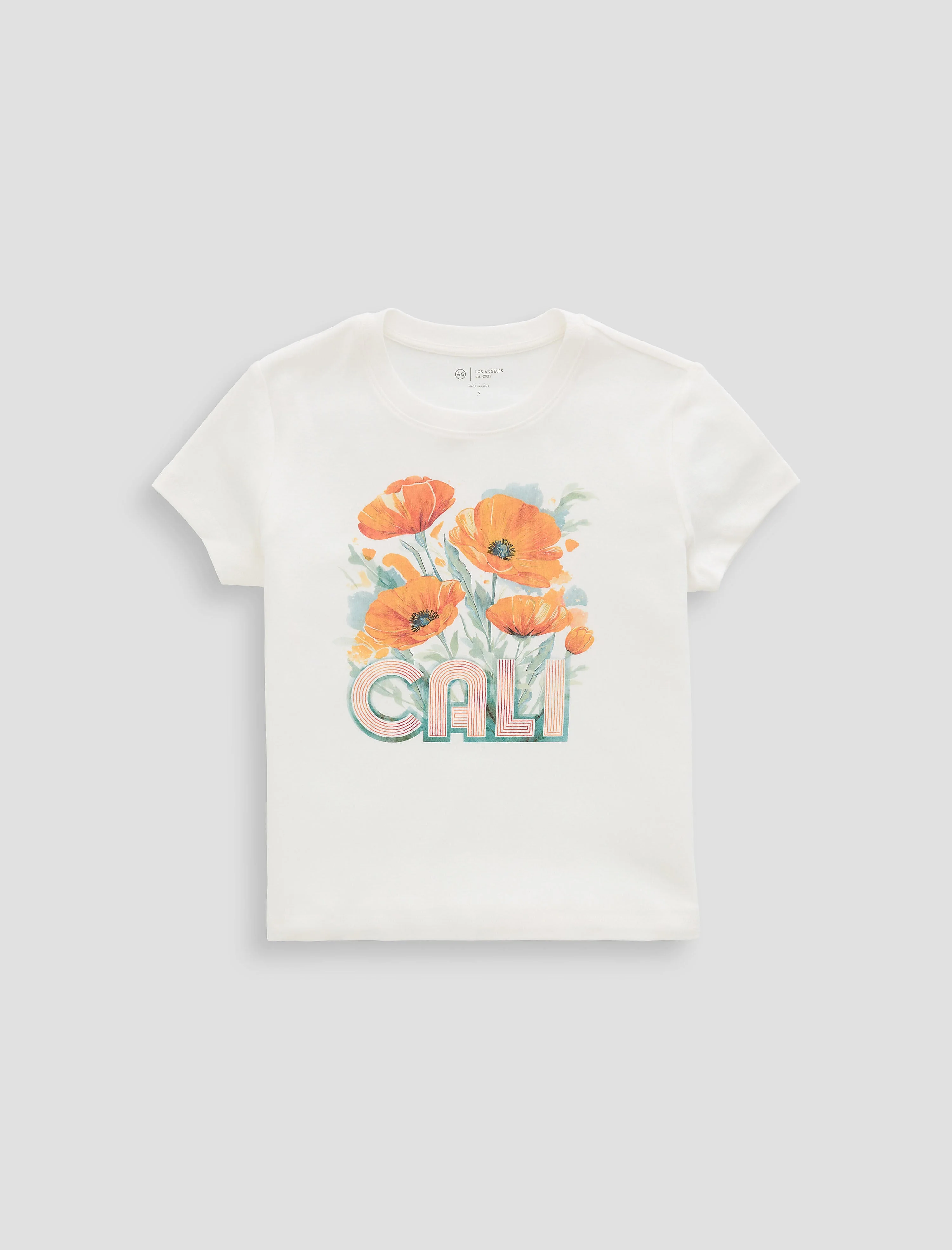 90's Vintage Crop Tee The Sadie Crew is a throwback essential T-shirt knitted from our cotton-blend 1X1 Everyday Baby Rib knit fabric. Inspired by vintage '90s crop tees, it features a slim, slightly shrunken fit that flatters and layers with ease. Designed in solid white, this tee features retro "Cali" text accompanied by California golden poppy flower graphics. DETAILS & FIT Model is wearing size S. - Body Length: 20 1/4" - Sleeve Length: 5 1/4" - Chest Width: 33 3/4" FABRIC & CARE 1X1 Everyday Baby Rib, 60% Cotton, 40% Modal