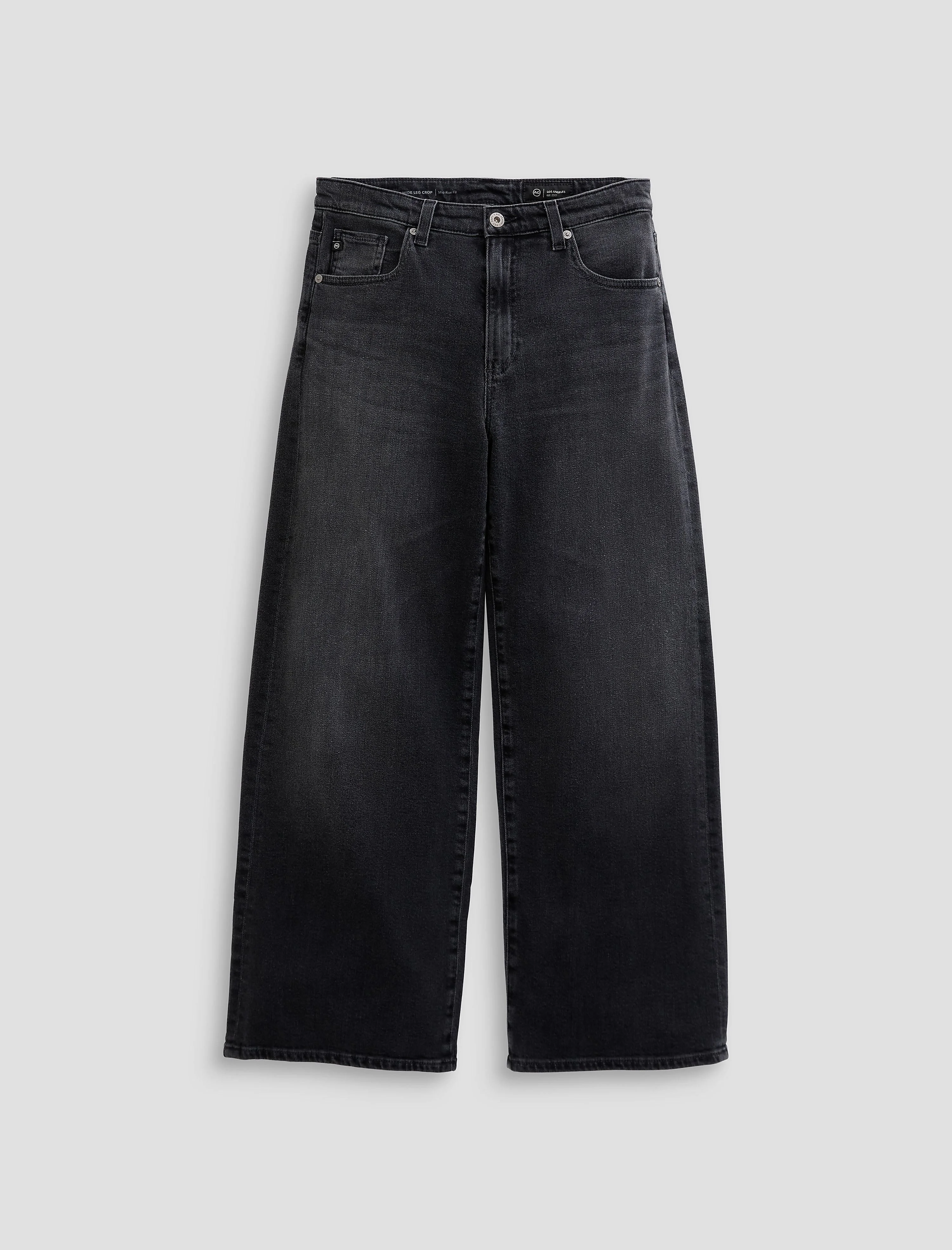 Mid-Rise Fit Saige Wide Leg Crop is crafted in Midnight Comfort Stretch Denim. This mid-rise jean is adored for its easy, relaxed silhouette and cropped leg. Designed with highs and lows, whiskering, and fading in our dimensional black wash, Nebula. DETAILS & FIT Model is wearing a size 26. - Front Rise: 10 1/4" - Knee Opening: 20 1/4" - Bottom Opening: 21" - Inseam: 27" FABRIC & CARE Midnight Comfort Stretch, 9.3 oz. 99% Cotton, 1% Elastane
