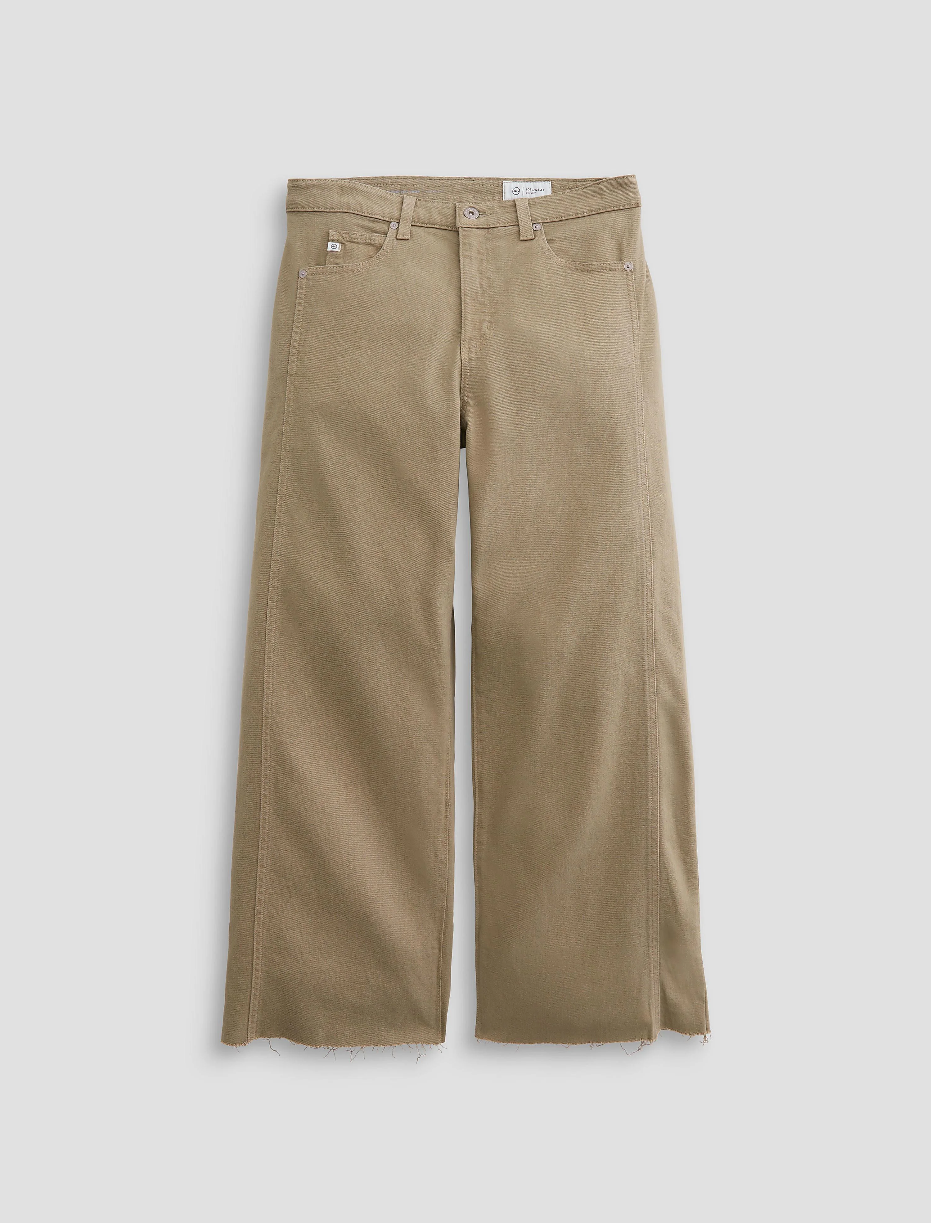 Mid-Rise Fit Saige Wide Leg Crop is crafted in Daytripper Stretch Raw Denim from the renowned Kaihara Mill in Japan. This mid-rise jean is adored for its easy, relaxed silhouette and cropped leg. Updated with raw-cut hem and side panels that connect to the pocket scoop fir a weathered yet more streamlined look. Made from unwashed and untreated raw material, this piece is a blank canvas for you to write your own story through natural wear with unique fading and creasing that happens over time. Designed in our earthy green wash, Dusty Sage. DETAILS & FIT Model is wearing a size 26. - Front Rise: 10 1/4" - Knee Opening: 20 1/4" - Bottom Opening: 21" - Inseam: 27" FABRIC & CARE Daytripper Stretch Raw Denim, 10 Oz. 72% Cotton, 26% Lyocell, 2% Elastane
