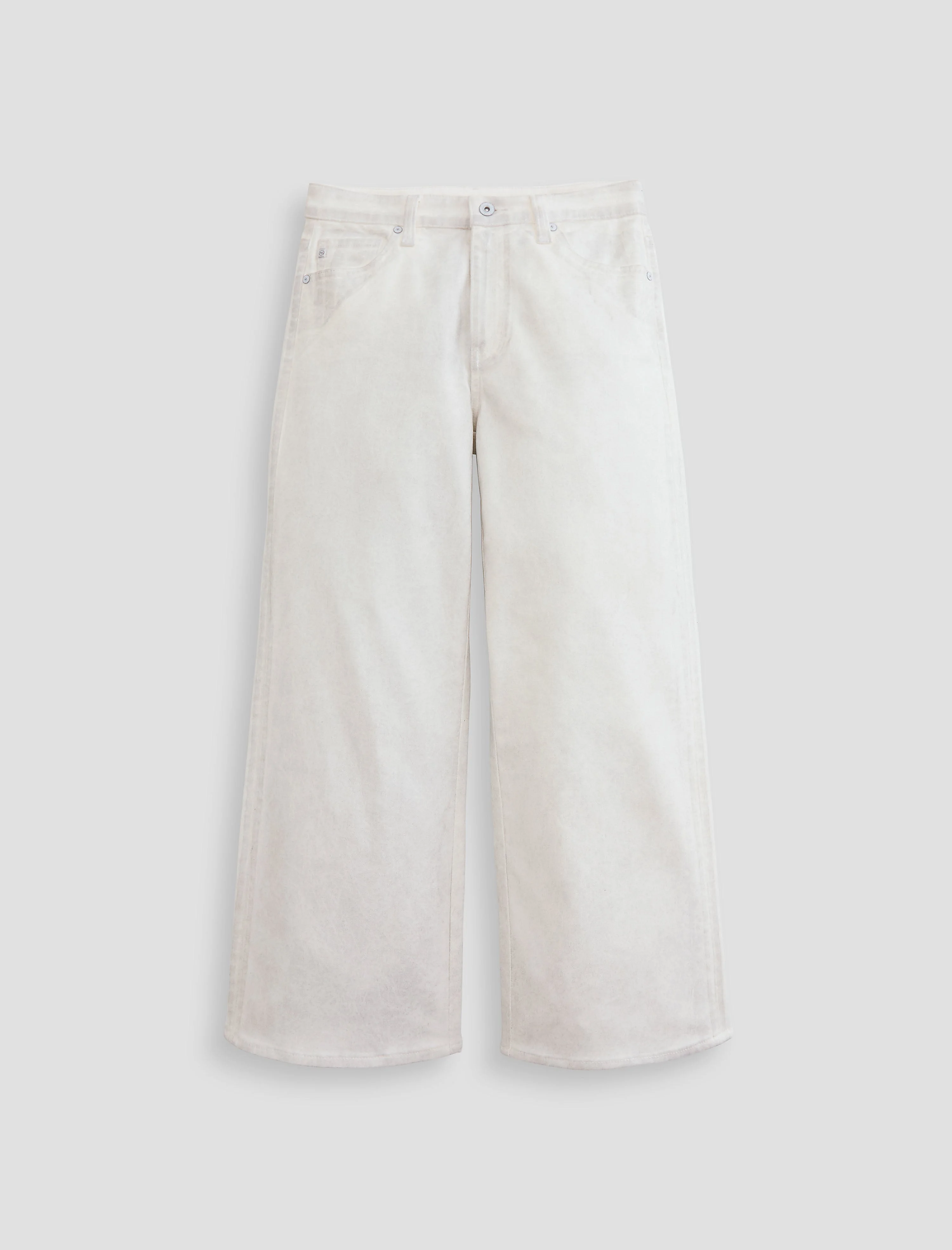 Mid-Rise Fit Saige Wide Leg Crop is crafted in AG Cloud Soft Denim.™ This mid-rise jean is adored for its easy, relaxed silhouette and cropped leg. Designed with light fading in Silver Glow, our washed down, slightly silver-tinted white wash. DETAILS & FIT Model is wearing a size 26. - Front Rise: 10 1/4" - Knee Opening: 20 1/4" - Bottom Opening: 21" - Inseam: 27" FABRIC & CARE AG Cloud Soft Denim™, Hyper Soft Bull Denim, 8.7 Oz. 93% Cotton, 6% Polyester, 1% Elastane