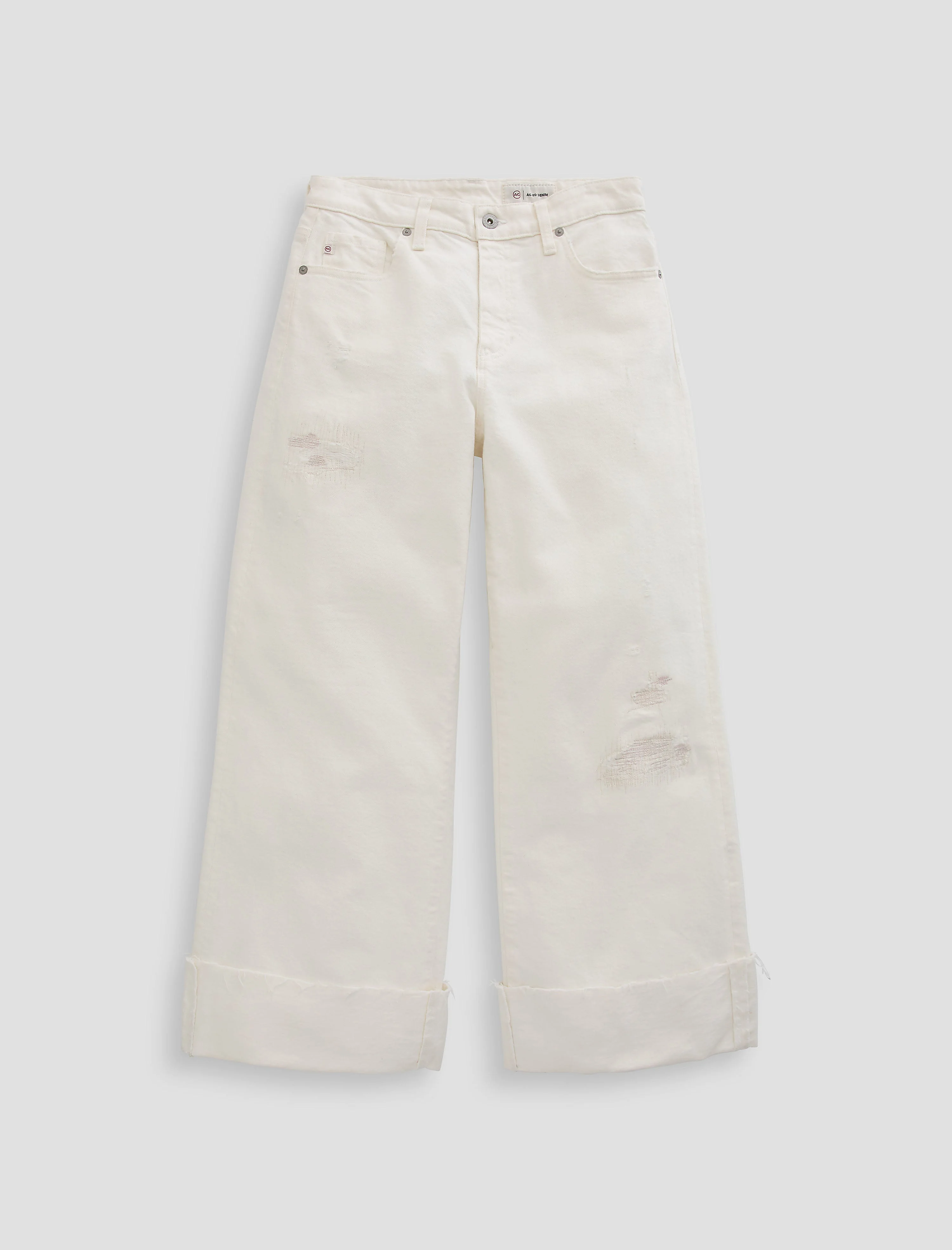 Mid-Rise Ankle Fit Saige Wide Leg Crop is crafted in Comfort Stretch Natural Weave Denim from the renowned Candiani Mill in Italy. This mid-rise jean is adored for its easy, relaxed silhouette and cropped leg. Thoughtfully designed with abrasions, repaired and mended detailing, and a cuffed raw-cut hem in our nearly-white wash, Powder. DETAILS & FIT Model is wearing a size 26. - Front Rise: 10 1/4" - Knee Opening: 20 1/4" - Bottom Opening: 21" - Inseam: 27" FABRIC & CARE Natural Weave Denim, 14.8 oz. 98% Cotton, 2% Elastane/Spandex