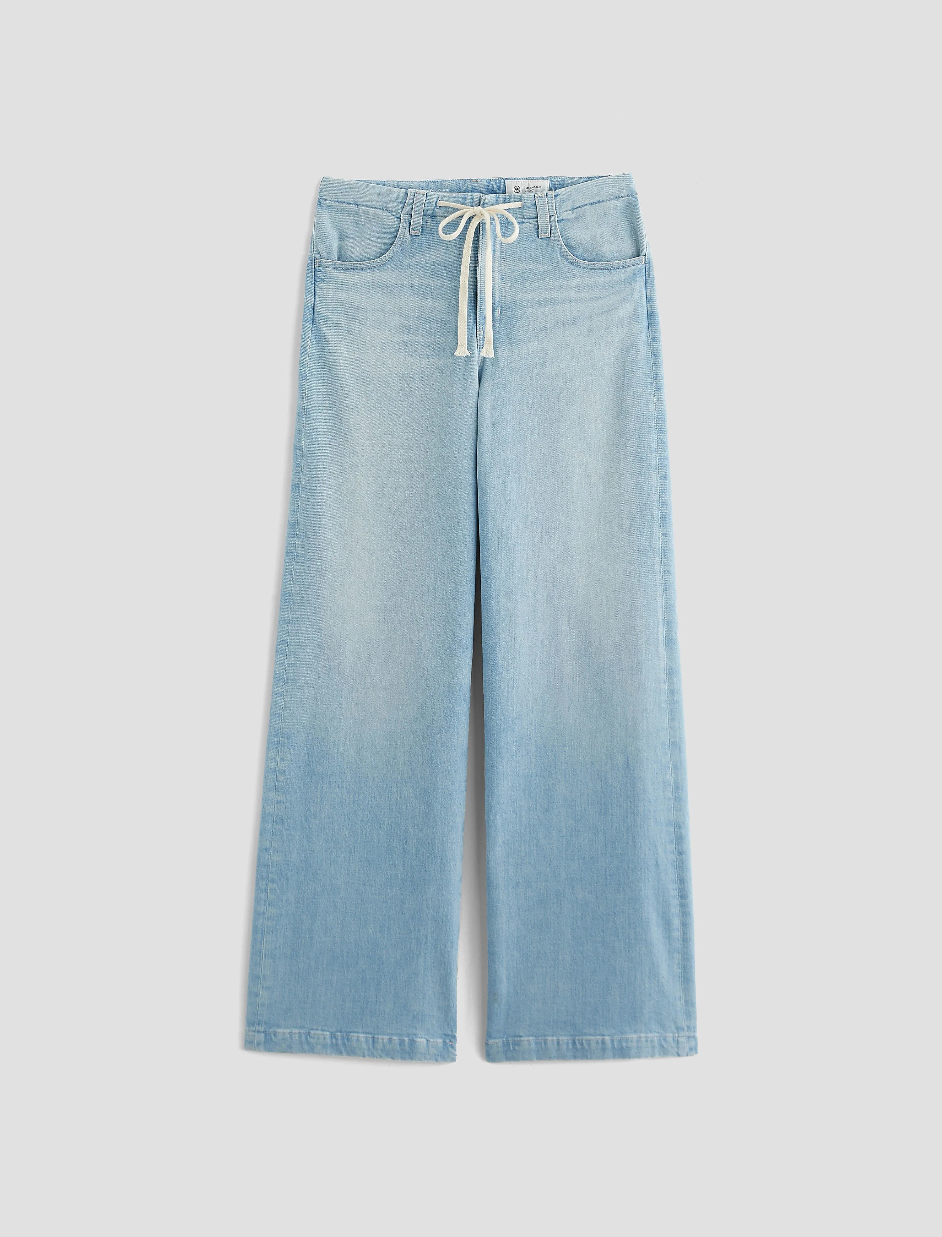 Low Slung Palazzo The Stella Cinched is a low-rise palazzo jean with a 32.5” inseam, made from Italian comfort stretch denim in a light wash. Designed with a subtle wide flare and an adjustable drawstring waist for a customizable fit. DETAILS & FIT Model is wearing size 26. - Front Rise: 10 1/2" - Knee Opening: 23 1/4" - Bottom Opening: 25" - Inseam: 32 1/2" FABRIC & CARE Journey Denim, 11 Oz. 98% Cotton, 2% Elastane