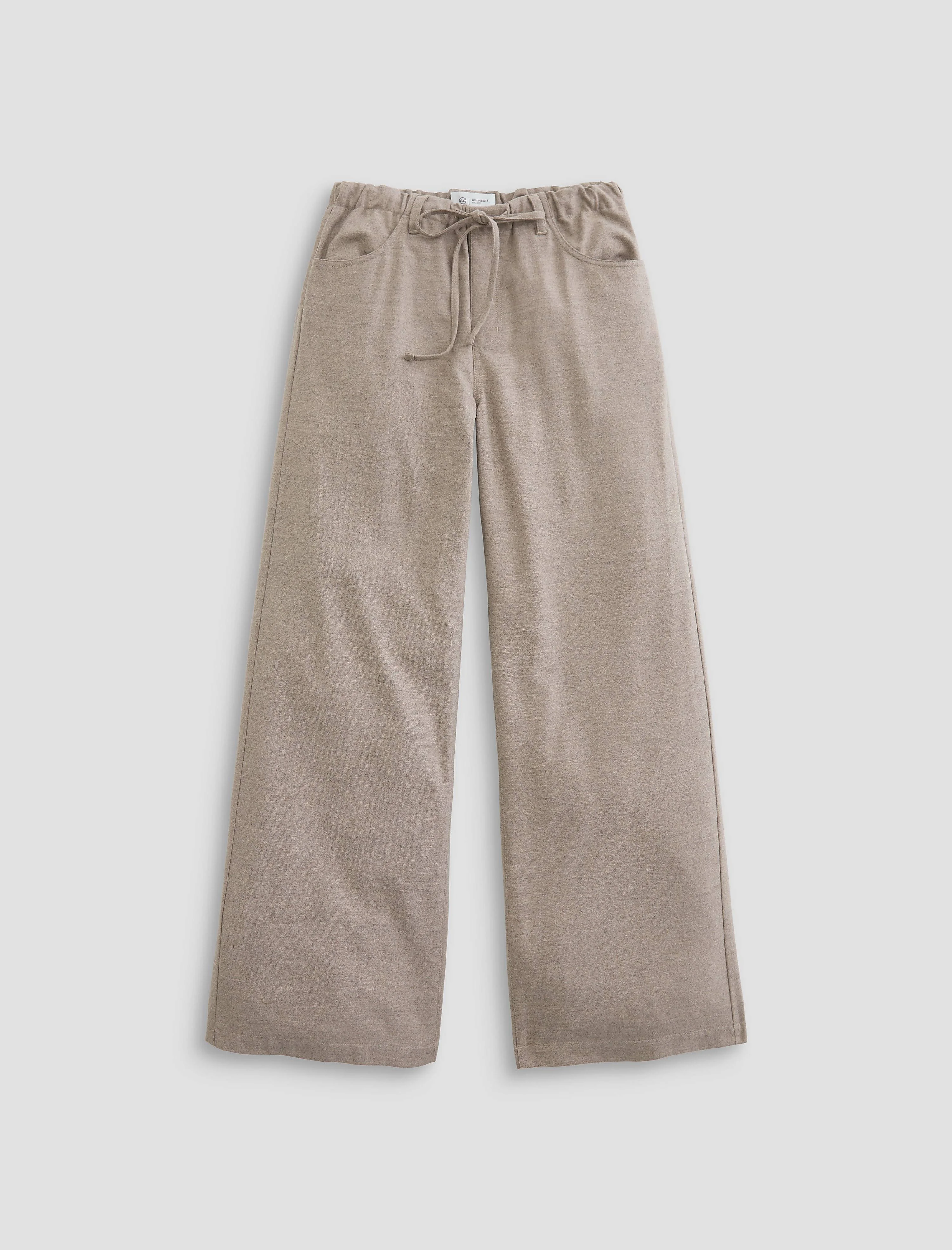 Wool Flannel Low Slung Palazzo Stella is our palazzo pant crafted from soft wool flannel in our cool beige, Melange Oat. This slouchy cool, low slung pant is cinched right below the waist with a self-tie drawstring closure. DETAILS & FIT Model is wearing size 26. - Front Rise: 10 1/2" - Knee Opening: 23 1/4" - Bottom Opening: 25" - Inseam: 32 1/2" FABRIC & CARE Soft Wool Flannel, 59% Polyester, 23% Viscose, 13% Wool, 3% Elastane