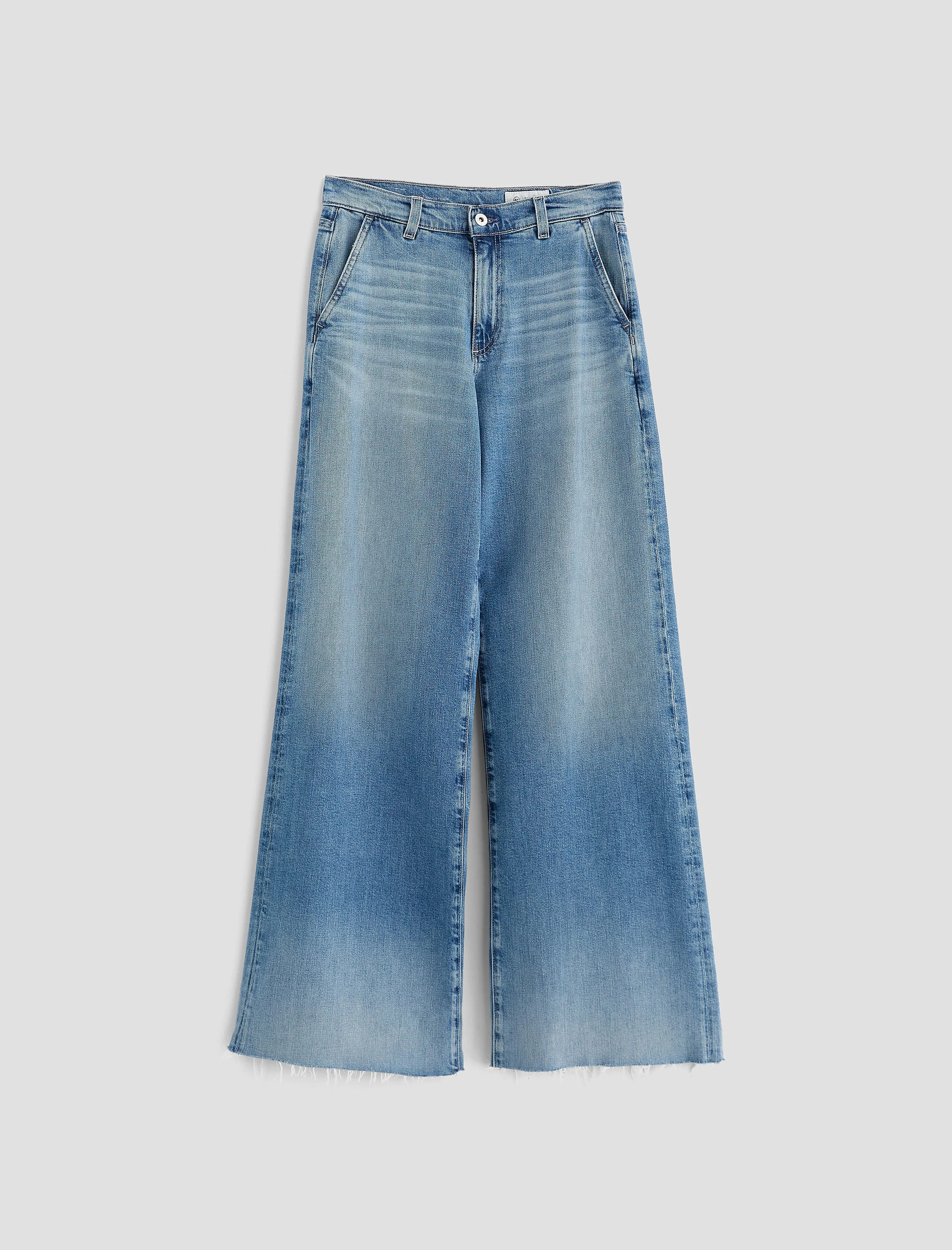 Low Slung Palazzo The Stella is a low-slung palazzo pant with a relaxed fit and an ultra-wide leg. Designed to sit low on the waist, this style features trouser-inspired slant pockets and raw hems for a laid-back finish. Crafted from 10 oz. Japanese Daytripper Stretch Denim, the fabric offers a soft, lightweight feel with comfortable stretch. It comes in a medium indigo wash. DETAILS & FIT Model is wearing size 26. - Front Rise: 10 1/2" - Knee Opening: 23 1/4" - Bottom Opening: 25" - Inseam: 32 1/2" FABRIC & CARE Daytripper Stretch Denim, 10 Oz. 72% Cotton, 26% Lyocell, 2% Polyurethane